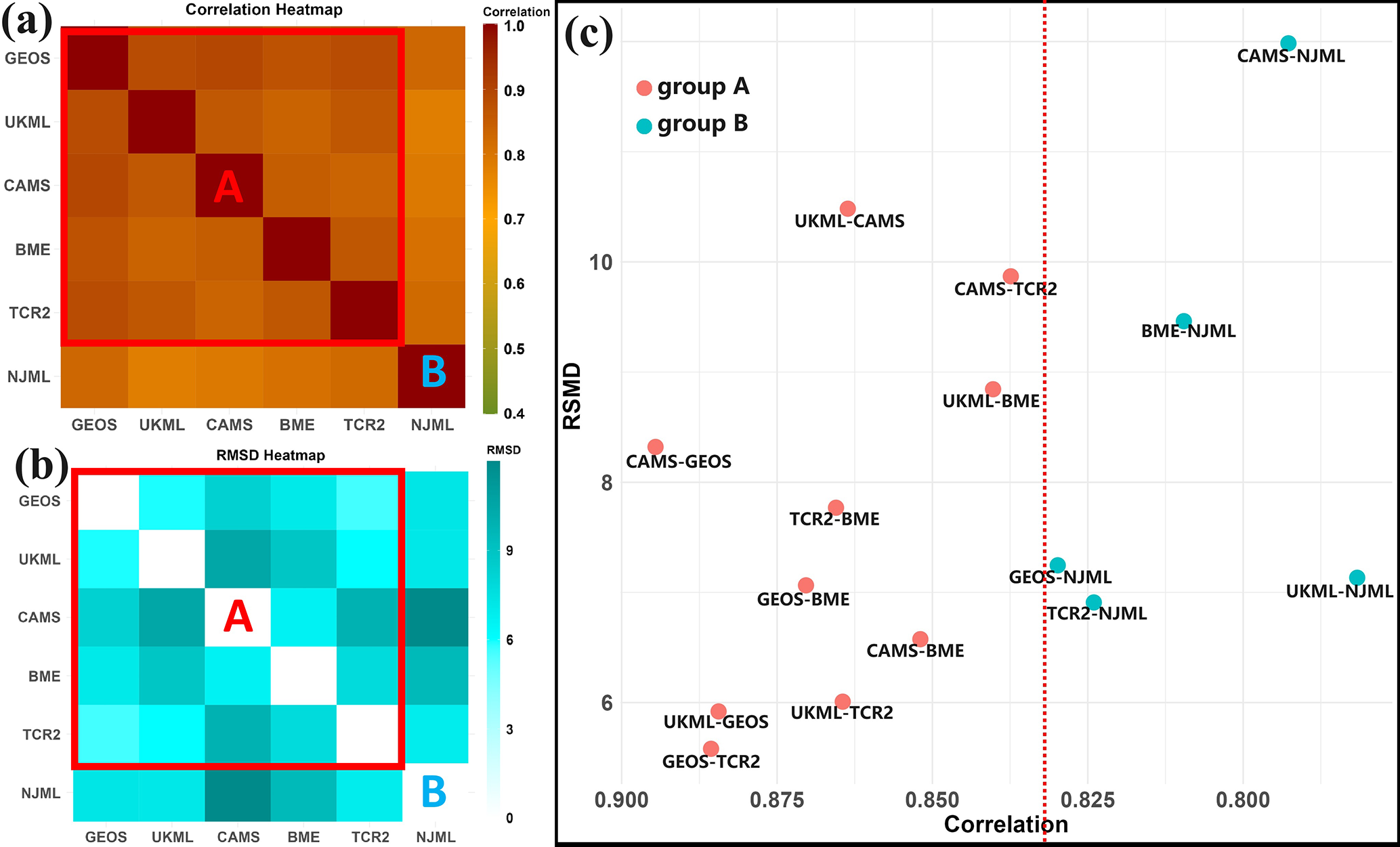 We calculated the correlation and RMSD between each pair of datasets for each year from 2006 to 2016. Figure 9 displays the average correlation and RMSD values over these 11 years as heatmaps. Figure 9c presents a scatter plot of the correlations and RMSD for each dataset pair. Using the correlation heatmap (Fig. 9a), we categorized the six datasets by the maximum difference method, identifying NJML as a distinct group (Group B) and the other five datasets as Group A. NJML's separation indicates its significant divergence in ozone geographic distribution compared to others. The scatter distribution in Fig. 9c reveals that most Group A data points cluster in regions of high correlation and low RMSD, suggesting broadly consistent ozone geographic distribution and concentration estimates within this group. Nevertheless, there is still substantial disagreement among the reanalysis products, likely because of the differences in forecast model performance and data assimilation configuration. Conversely, Group B has lower correlations. Interestingly, RMSD does not consistently decrease with increasing correlation, indicating that similar geographic distribution patterns can still yield significant differences in ozone concentration estimates. This is particularly evident with CAMS and GEOS-Chem, which exhibit the highest correlation with a large RMSD, suggesting substantial differences in ozone estimation.
