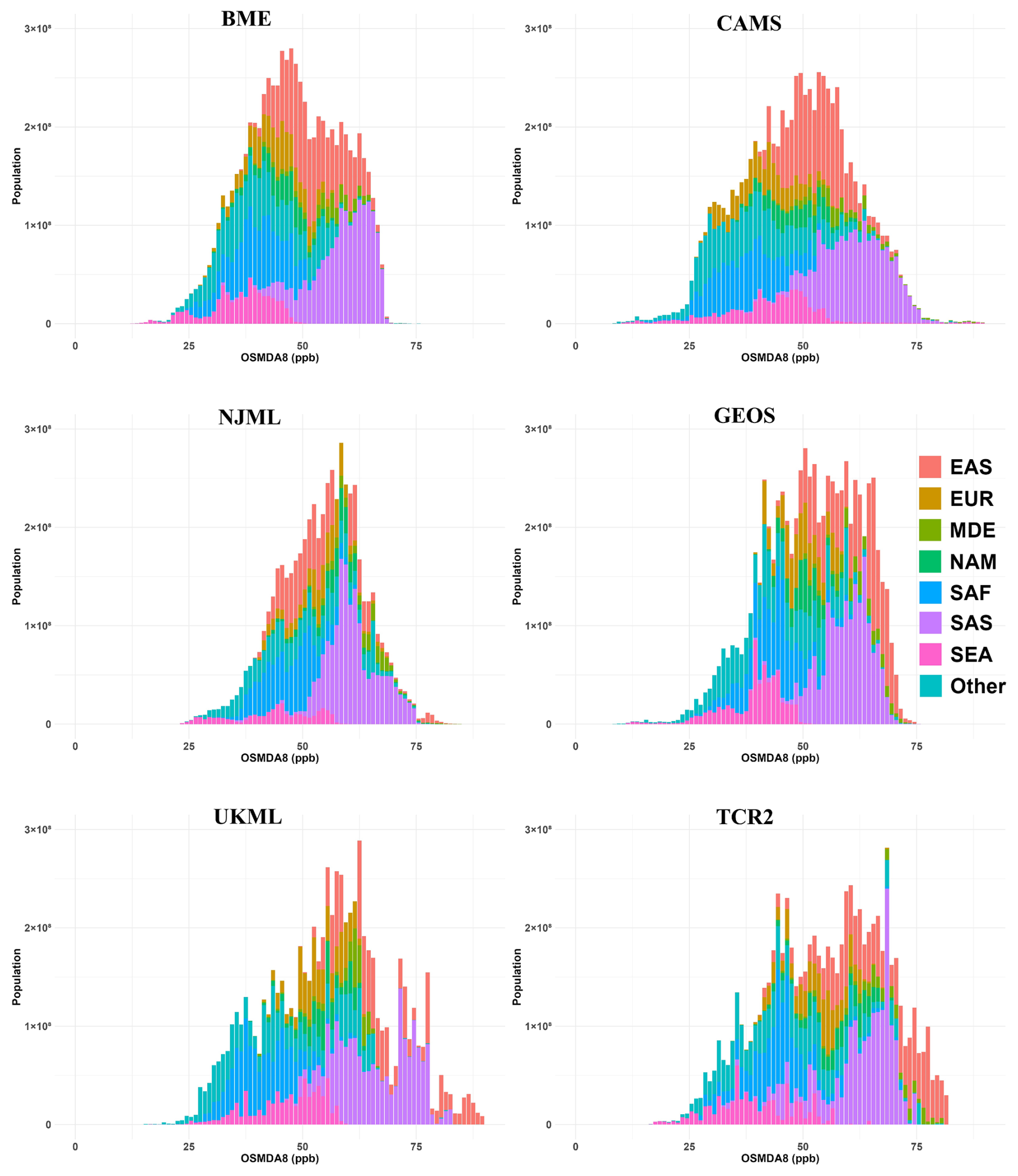 Figure 10 illustrates the distribution of population in various regions exposed to average OSDMA8 from 2006 to 2016, as per each dataset. We also calculated the distribution of population regarding the lower and upper bounds of OSDMA8 from 2006 to 2016 for each dataset, as shown in Fig. S12. For the period 2006–2016, a majority of the population in most datasets is exposed to concentrations above 40–50 ppb. Populations in regions such as East Asia and South Asia appear to be exposed to higher ozone concentrations in all datasets compared to other regions, which supports our findings from exposure based on TOAR-II observations in Fig. 3. Conversely, populations in the Sub-Saharan Africa and Southeast Asia regions typically experienced concentrations below 50 ppb. The different regions show different distributions of population ozone exposure, and comparisons between datasets reveal considerable variations in the ozone distribution for each region. Some datasets (e.g., CAMS and TCR-2) show a wider distribution of population across ozone concentrations compared to others (e.g., NJML). In BME and CAMS, after South Asia, a significant fraction of the population in the East Asia region is exposed to levels above 50 ppb, while this proportion in North America, Europe, and the Middle East is less than in the other four datasets. When focusing on exposure above 70 ppb, South Asia dominates in BME, CAMS, and NJML, while East Asia leads in GEOS-Chem, UKML, and TCR-2. All six datasets clearly demonstrate a higher impact of ozone pollution in Asia compared to North America and Europe, aligning with previous findings based on TOAR observations (Chang et al., 2017).
