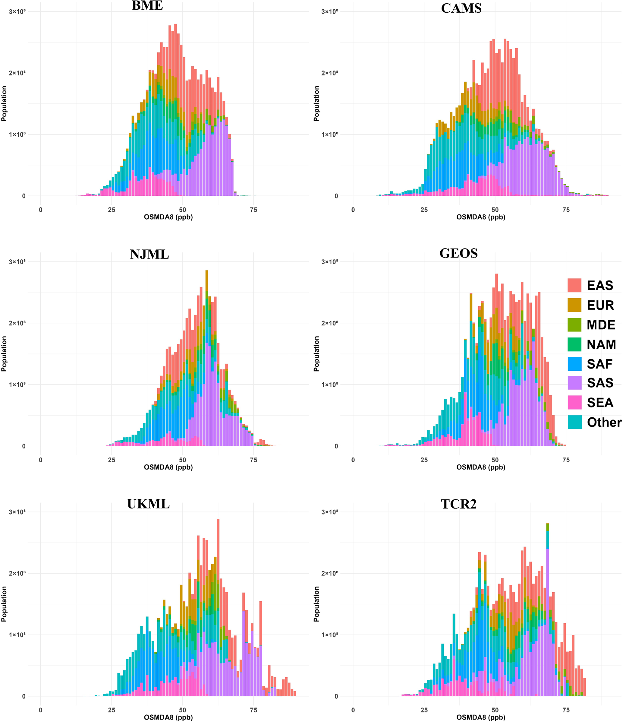 Table 4 elucidates each region's population share above 30, 50 and 70 ppb thresholds from 2006 to 2016. Results are presented as the estimate with the lower and upper bound in parentheses (e.g., 42 % [24 %, 66 %]). Detailed table of population share for each year (2006 to 2016) are shown in Table S10. For BME and CAMS, the global average of the population exposed to more than 50 ppb is 42 % [24 %, 66 %] and 48 % [18 %, 76 %], respectively, indicating that more than half of the population us exposed to lower concentrations. Regional exposure estimates vary in East Asia, where the proportion of the population exposed to more than 50 ppb ranges from 61 % [28 %, 94 %] in BME to 99 % [62 %, 100 %] in UKML, 95 % [58 %, 100 %] in GEOS-Chem, and 94 % [63 %, 100 %] in TCR-2. The differences are stark in Europe, with BME and CAMS showing only 16 % [0 %, 56 %] and 9 % [0 %, 58 %] exposure, respectively, over 50 ppb, while NJML, UKML, and TCR-2 report much higher exposures of 76 % [22 %, 96 %], 77 % [2 %, 100 %], 70 % [5 %, 100 %]. Focusing on the highest threshold, TCR-2 and UKML project that 41 % [0 %, 79 %] and 31 % [13 %, 85 %] of the population in East Asia exposed to levels above 70 ppb, respectively. In the Middle East, TCR-2's estimates are significantly higher than other datasets, indicating that 38 % [0 %, 86 %] of the population is exposed to average concentrations above 70 ppb. Despite these regional differences, the six datasets agree that a large majority of the global population is exposed to ozone above the WHO guideline for OSDMA8 (30 ppb) with percents ranging from 93 % [74 %, 99 %] (CAMS) to 99 % [96 %, 100 %] (NJML).