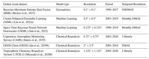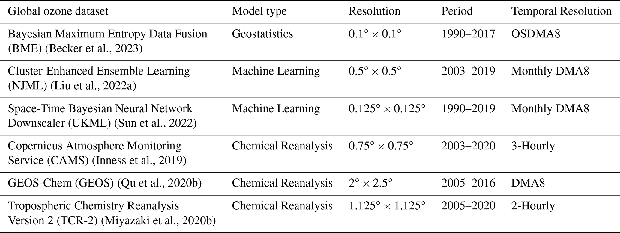 Observational data are publicly available from the TOAR-II data portal (http://toar-data.org, last access: 20 May 2025) (Schröder et al., 2021). The BME dataset of global ground-level ozone estimates (Becker et al., 2023) is publicly available at https://zenodo.org/records/14996361 (Becker et al., 2025). The NJML dataset is publicly available at https://doi.org/10.5281/zenodo.6378092 (Liu et al., 2022b). The CAMS reanalyses data (Inness et al., 2019) are publicly available from https://doi.org/10.24381/d58bbf47 (Copernicus Atmosphere Monitoring Service, 2020). The TCR-2 reanalyses data are publicly available from https://doi.org/10.5067/NN87W53OVGUS (Miyazaki, 2024). Other datasets of global ozone concentrations can be obtained by contacting the creators of these datasets.