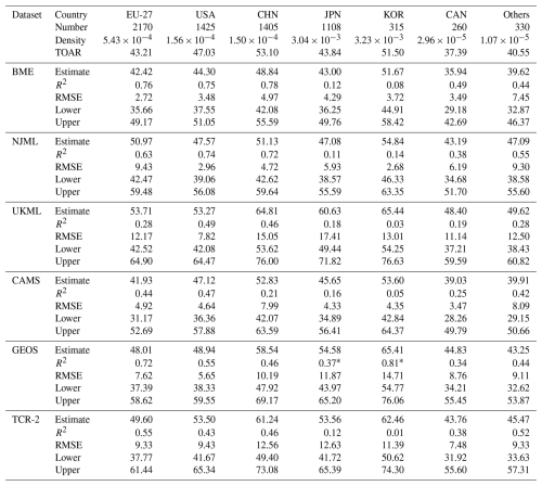 Table 2Performance evaluation of six datasets for countries (and the EU) with the most monitors in 2016 against TOAR-II observations of OSDMA8 based on the gird-to-grid scenario. Number is the number of the TOAR-II monitor stations in each country. Density (per km2) is the density of the TOAR-II monitors in each country based on land area. Estimate is the average of the grid estimates for each dataset at the TOAR-II monitor locations in each country. Linear regression R2 and root mean squared error (RMSE) against TOAR-II observations in each country are based on a grid-to-grid evaluation at each dataset's native resolution against re-gridded TOAR-II observations. The Lower and Upper Bound represent the 95 % confidence interval for the Estimate, calculated from the linear regression of each dataset against TOAR-II observations. Country names are United States of America (USA), China (CHN), Japan (JPN), South Korea (KOR), Canada (CAN). EU-27 includes Austria, Belgium, Bulgaria, Croatia, Cyprus, Czech Republic, Denmark, Estonia, Finland, France, Germany, Greece, Hungary, Ireland, Italy, Latvia, Lithuania, Luxembourg, Malta, Netherlands, Poland, Portugal, Romania, Slovakia, Slovenia, Spain, Sweden. Others is all other countries in TOAR-II apart from those listed. Performance evaluations for other years in these countries, are shown in Table S8.
