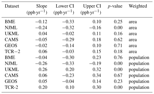 Table 3Yearly trends of area-weighted, and population-weighted global mean of ground-level ozone for six datasets with 95 % confidence intervals (LowerCI and UpperCI) and p-values from 2006 to 2016.
