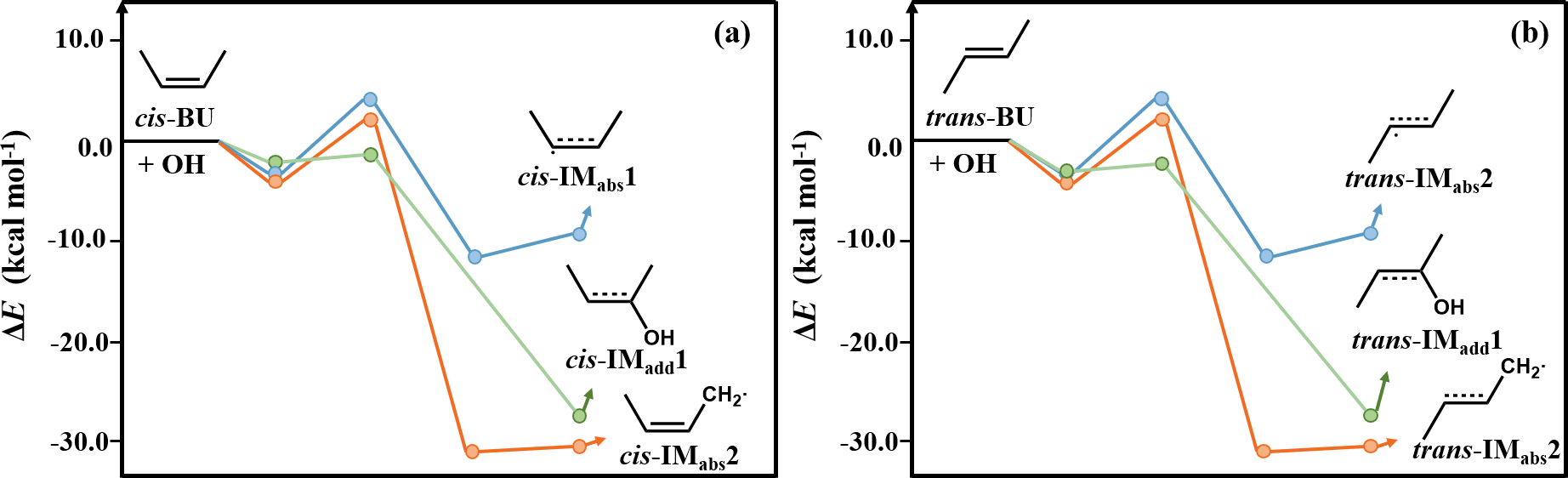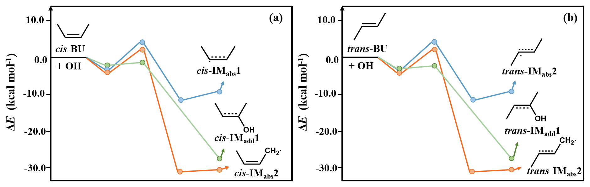 Figure 1Potential energy surfaces (PESs) for the OH-initiated reactions of (a) cis-BU and (b) trans-BU with OH (unit: kcal mol−1).
