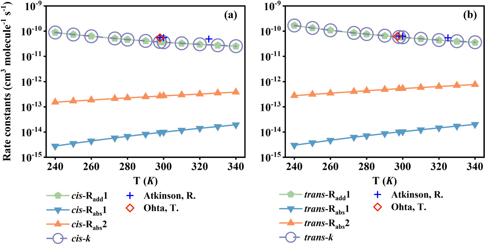 Figure 2The rate constants () of (a) cis-BU and (b) trans-BU with OH against the temperature range of 240–340 K. The experimental rate constants are from Atkinson (2000) and Ohta (1984), respectively.