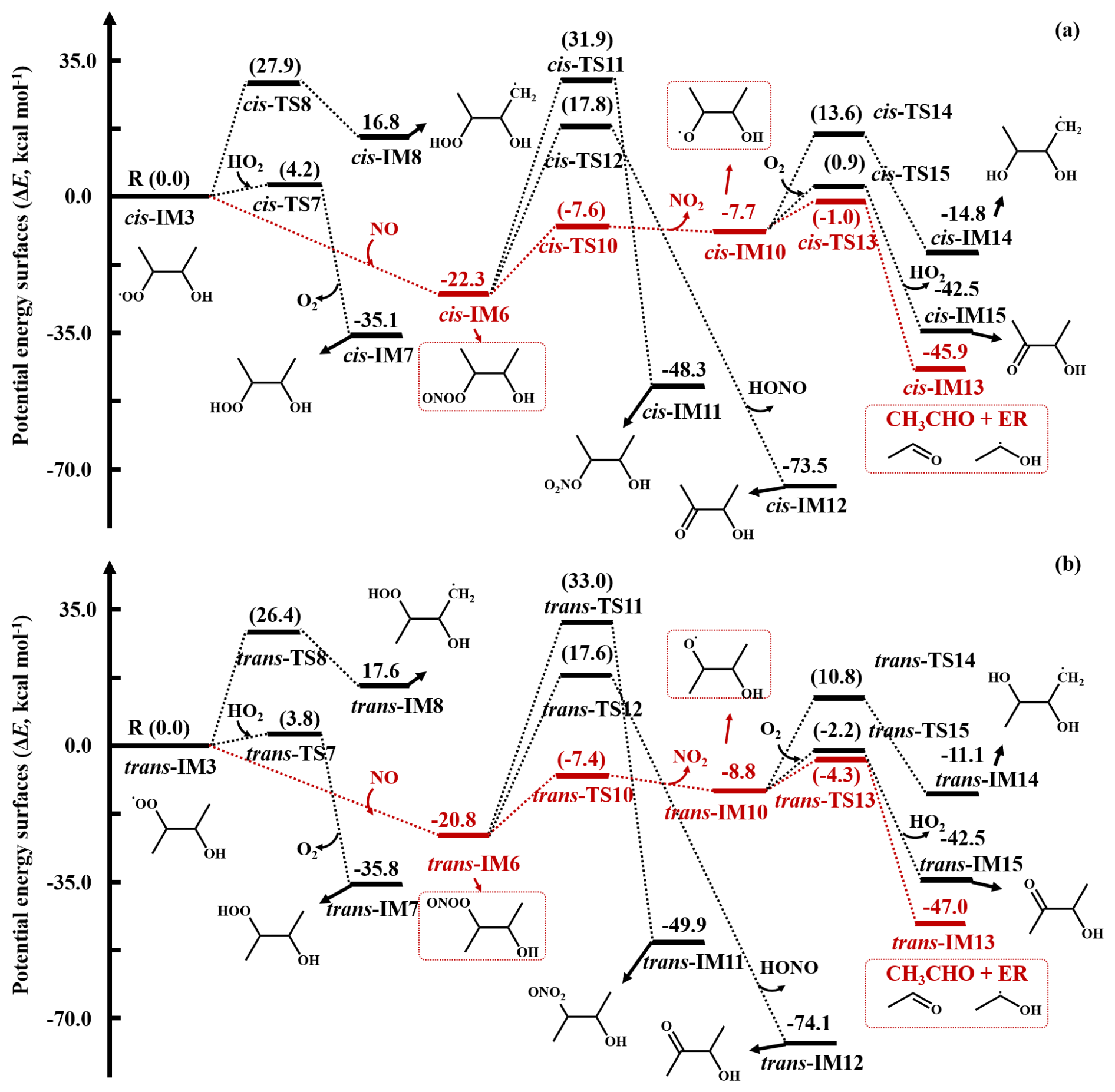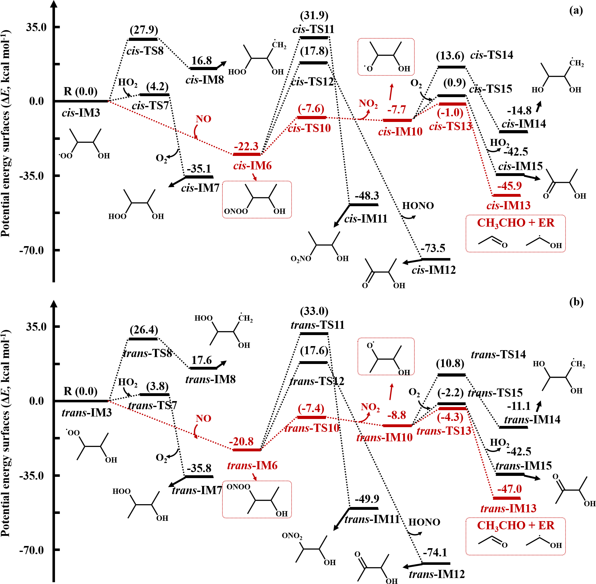 Similarly, as shown in Fig. S5, the subsequent reactions of trans-RO2 involve three essential steps: (i) the association with NO to form trans-RO2NO, (ii) the NO2-elimination of trans-RO2NO to produce trans-RO, and (iii) the dissociation of trans-RO to yield CH3CHO and CH3CHOH radical. However, the differences between the subsequent reactions of cis-IMadd1 and trans-IMadd1 are reflected in the lower reaction energy barriers and the larger rate constants of trans-IMadd1. For example, the value of trans-R12 pathway is 11.99 kcal mol−1, which is 2.6 kcal mol−1 lower than that of cis-R12 pathway, and the corresponding rate constant of trans-R12 pathway is six times larger than that of cis-R12 pathway. It is attributed to a stronger steric hindrance in subsequent reactions of cis-IMadd1 relative to trans-IMadd1. Therefore, CH3CHO and CH3CHOH radicals are more rapidly produced from trans-BU relative to cis-BU in the atmosphere.