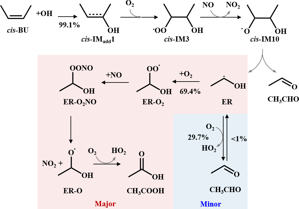 AVOCs have profound impacts on air quality, human health and climate, and BU is the major AVOCs emitted from the petrochemical regions. Hence, from combined quantum chemical calculations and photochemical box model simulations, this study provides a systematic insight into the multi-generation oxidation mechanisms, kinetics, and atmospheric fate of BU and its contribution to the formation of organic acid. The initial reactions of both the cis- and trans-isomers of BU readily involve OH addition to the C=C double bond, yielding the corresponding OH-adducts. Subsequent reactions proceed via O2 addition, NO-association, NO2-elimination, and further decomposition to produce CH3CHO and CH3CHOH radical. CH3CHOH radical is converted into CH3COOH and HO2 radical, facilitated by O2 and NO through the pathways of O2 addition, NO-association, NO2-elimination, and H-abstraction. Our mechanism highlights that the rapid and irreversible reaction of CH3CHOH• with O2 and NO is a key mechanistic step in the formation of CH3COOH, which is one of the most favorable products, with a yield of 57 %. However, previous experimental studies on the OH-initiated oxidation of BU obtained a low yield of CH3COOH (<10 %) (Atkinson, 1997; Muthuramu et al., 1993). Given the rapid partitioning of gas CH3COOH into the liquid phase in the experimental environment (Franco et al., 2021), the measured yield likely corresponds to the lower experimental limit.