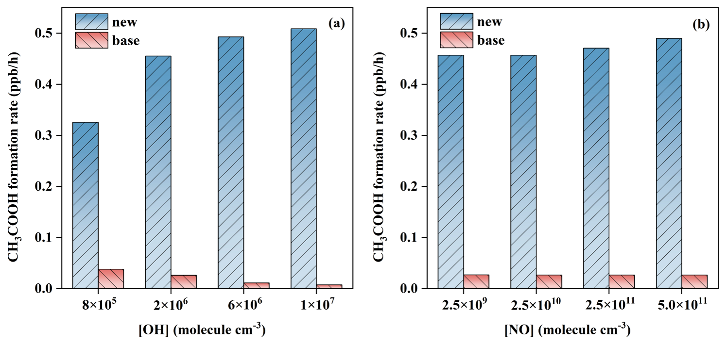 This study further reveals that the multi-generation oxidation of BU in the petrochemical environment, may be particularly important for organic acid formation. Using our calculated kinetics data, we estimate a lifetime of less than 4 h for BU in the petrochemical environment, indicating that BU are rapidly oxidized following the local emission. By adding our established mechanisms to the photochemical box model simulations, our calculated formation rates and yields of CH3COOH are at least 10 times higher than those from the traditional mechanism. Besides, the impact of OH concentrations on the formation rate of CH3COOH is greater than that of NO concentrations. That is, the formation rate of CH3COOH rapidly drops, as OH concentrations decrease. This highlights the dominant role of OH radicals in the initial oxidation steps of multi-step oxidation processes. With the increasing oxidative capacity and decreasing nitrogen oxides (NOx) abundance in polluted areas (Newland et al., 2021), further study is needed to explore the impacts of these factors on the multi-generation oxidation reactions of alkenes.