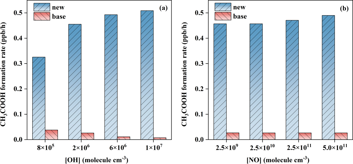 To evaluate the impact of our established mechanisms on the formation of organic acids in the petrochemical regions, a box model simulation was performed to quantify the production rate () and yield () of CH3COOH by using the MCM v3.3.1 coupled with the AtChem2 box model. For comparison, the corresponding simulation under the traditional mechanism of CH3COOH formation in MCM v3.3.1 was also carried out. All the simulations were conducted using the measured mixing ratios of BUs, OH, and NO in a typical petrochemical industrial region, and all the settings were posted in Table S1 (Yang et al., 2024). It is evident from Figs. 5 and S10 that the values corrected with our proposed mechanism exhibit a significant increase of more than ten times under typical petrochemical conditions, where the concentrations of [OH] and NO ([NO]) are 2×106 molecule cm−3 and 10 ppb (2.5×1011 molecule cm−3), respectively. Even when [OH] and [NO] decrease, the values are also increased by more than five times. Large production rates of CH3COOH correspond to the high values, for example, the value in cis-BU+OH reaction with 57 % is more than ten times higher than that without our proposed mechanism under the typical petrochemical conditions. Hence, the photooxidation of cis-/trans-BU corrected by our proposed mechanisms has a significant impact on the formation of organic acids in the petrochemical source regions, with particularly pronounced effects on the formation of small-molecule gaseous organic acids.