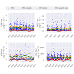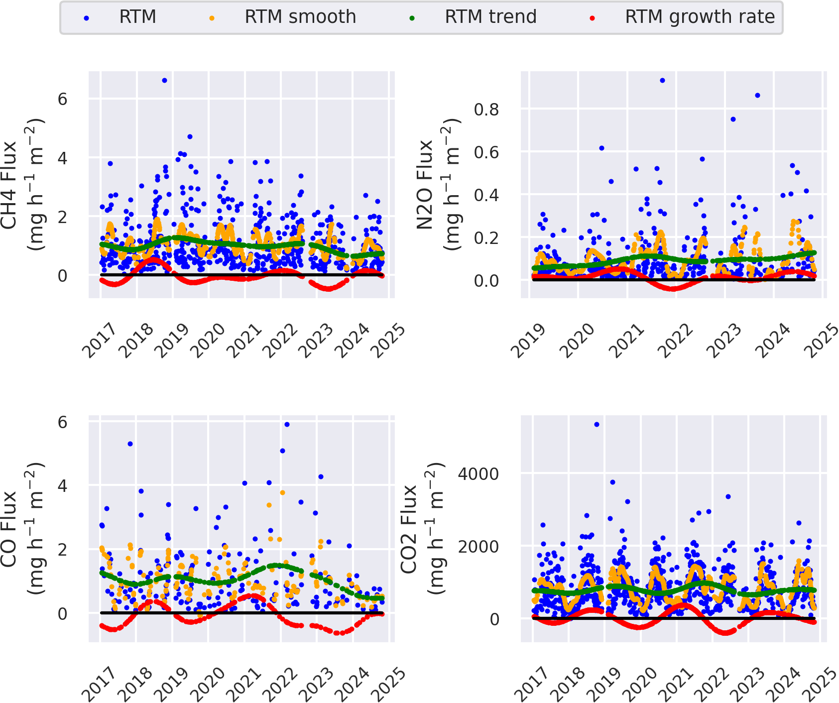 Figure 11 shows the fluxes of CH4 calculated using the STILT_Noah configuration with the footprints. The figure also includes the bottom-up flux estimate for each footprint using EDGAR and TNO. The averages over 2017–2024 are shown in Table 2. On Fig. 12, in the top left panel, the RTM fluxes with the smoothed fluxes, their trend, and growth rate are shown.