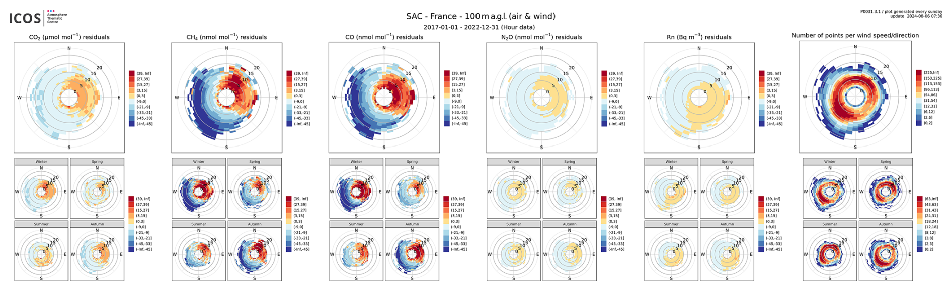 Figure 1 presents the mixing ratios and wind roses for CO2, CH4, CO and N2O at 100 m over the 2017–2022 period. The main wind direction is south-west in winter and autumn while in spring, wind comes also often from the north-west. In summer, wind covers almost the whole quadrant except south and east. For any season, the elevated concentration of CO2, CH4, CO and N2O are found in the north-west with the Paris area and further away the urbanised regions of Germany, Netherlands and Belgium.