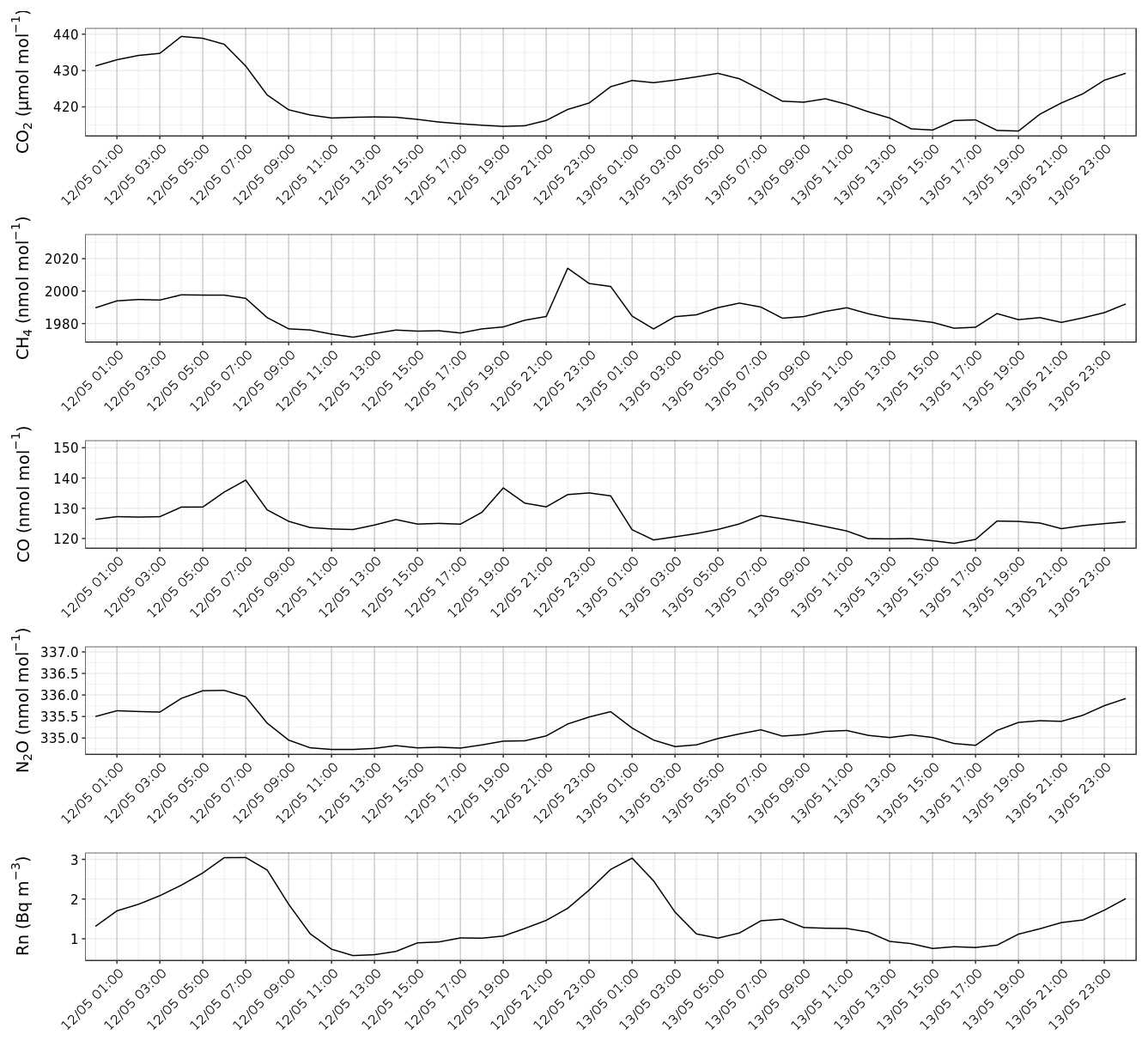 Yver Kwok, C.: CO2, CH4, CO and N2O fluxes at Saclay, France between 2017 and 2024 calculated with the Radon Tracer Method, Zenodo [data set], https://doi.org/10.5281/zenodo.17512429, 2025. a, b