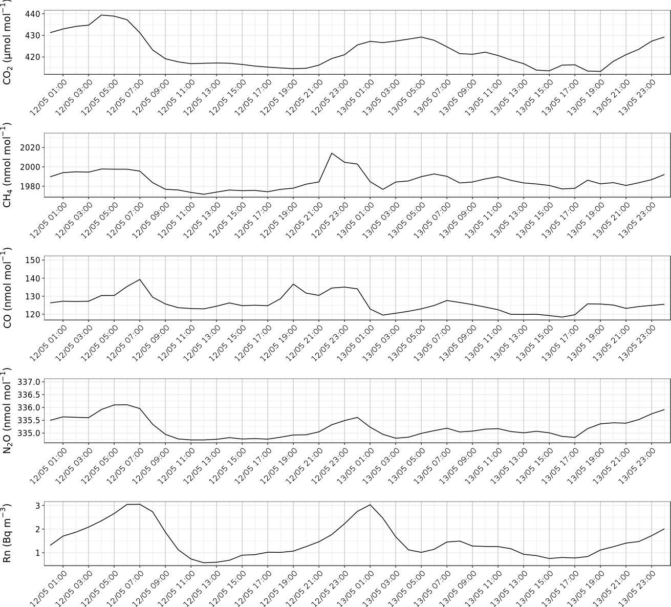 JRn is the 222Rn flux over the region of influence, is the slope of the linear regression between the observations of the gases. Both mixing height and net surface flux of the catchment area are averaged for the observation period, and is the factor used to correct for 222Rn radioactive decay. In Levin et al. (2021), the whole effect of the decay, estimated to be less than 10 %, is neglected. Here, we apply the correction as defined in Schmidt et al. (2001). As observations for greenhouse gases are usually reported as mixing ratios, it is necessary to convert them into concentrations before applying the RTM. We use the molar volume at 288.15 K and 101 325 Pa to match the radon data treatment defined in Kikaj et al. (2025).