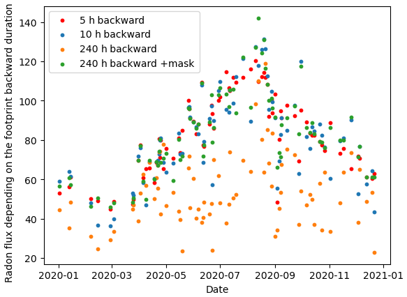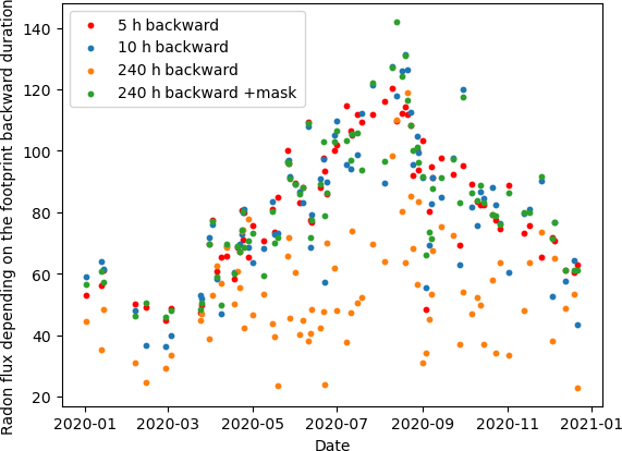 By default, it uses the footprints already calculated by the Lagrangian model STILT as configured on the CP (available for all ICOS sites and more for at least 2018 to 2022 https://stilt.icos-cp.eu/viewer/, last access: 16 October 2025). The STILT footprints are available every 3 h and cover the region 33° S–73° N, 15° W–35° E with a resolution of ° by °, approximately 10 km × 10 km. The STILT model is forced with the European Centre for Medium-Range Weather Forecast (ECMWF) Integrated Forecasting System (IFS) operational analysis. As these footprints are initially calculated for CO2, no term for the radon radioactive decay has been added. By default, these footprints are going back in time for 10 d which is not suitable for our study. To correct this issue, we decided to apply a mask over the footprint representing the zone usually covered when going backward 5 to 10 h only. To do so, we calculated the mean wind speed over our period of study for the nights we had events. This average, 6 m s−1, multiplied over the 8 h of our nocturnal window, gave us a radius of about 175 km. From this distance, we applied a rectangular mask centered on Saclay running from 50.28 to 47.15° N and −0.24 to 4.53° W. For the year 2020, we compared the radon flux calculated for different backward duration with the standard STILT run with and without applying our mask. On Fig. 3, we show the radon fluxes for 5, 10, 240 h with and without mask. We see, that with the mask the radon flux from the 10 d long backtrajectories is similar to the 5 and 10 h backtrajectories radon fluxes. Thus, we apply this mask for the rest of our study.