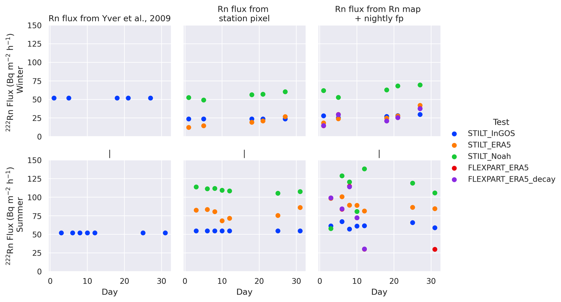 Figure 4 shows the daily radon flux for February 2019 at the top and August 2019 at the bottom for the different runs and three different fluxes. On the left, the fixed flux from Yver et al. (2009) is displayed. In the middle, the fluxes are derived only from the station pixel of the different exhalation maps. On the right, the radon fluxes come from the combination of the exhalation maps and the nighttime footprint. For each panel, only the runs leading to different results are shown, e.g. for the left panel, only STILT_InGOS is shown as model and 222Rn exhalation map are not used with the fixed flux from Yver et al. (2009). Results show that 222Rn fluxes in winter are generally lower than those in summer, as it was expected from the literature (Stranden et al., 1984). Indeed, in summer, the lower water content in the soil during this drier period leads to higher fluxes than in winter and spring, when the increased precipitations and the low temperatures lead to a reduced evaporation and an increased soil moisture that can prevent the radon to exhale. In the middle panels, daily radon fluxes based on GLDAS-Noah reanalysis (STILT_Noah) for this station pixel and period of time, display higher values than the ones calculated using ERA5-Land data (STILT_ERA5). Specifically daily fluxes vary between 12 and 27 for STILT_ERA5 and in the range of 49 to 60 for STILT_Noah, while STILT_InGOS is at 24 in February 2019. In August 2019, they vary between 68 and 86 for STILT_ERA5, between 105 and 112 for STILT_Noah and STILT_InGOS is at 55 .
