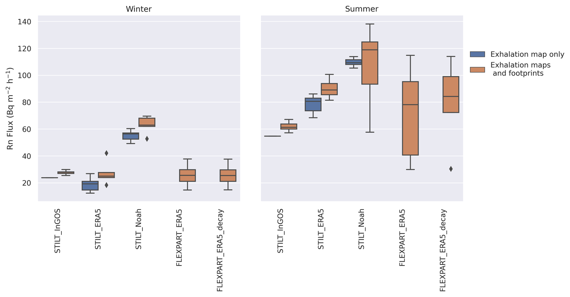 As shown in Fig. 5, in winter, the radon exhalation rate is driving the difference between the different tests. Between STILT_InGOS and STILT_Noah, there is a 97 % difference while between STILT_InGOS and the other runs, the difference is below 12 %. In summer, this difference is seen when using only the exhalation map pixel value but when using the footprint, the variability of all runs compared to STILT_ERA5 is between 5 % and 37 %. STILT_Noah still shows the higher difference but the FLEXPART model leads to difference almost as high using the lower radon exhalation rate as in STILT_ERA5.