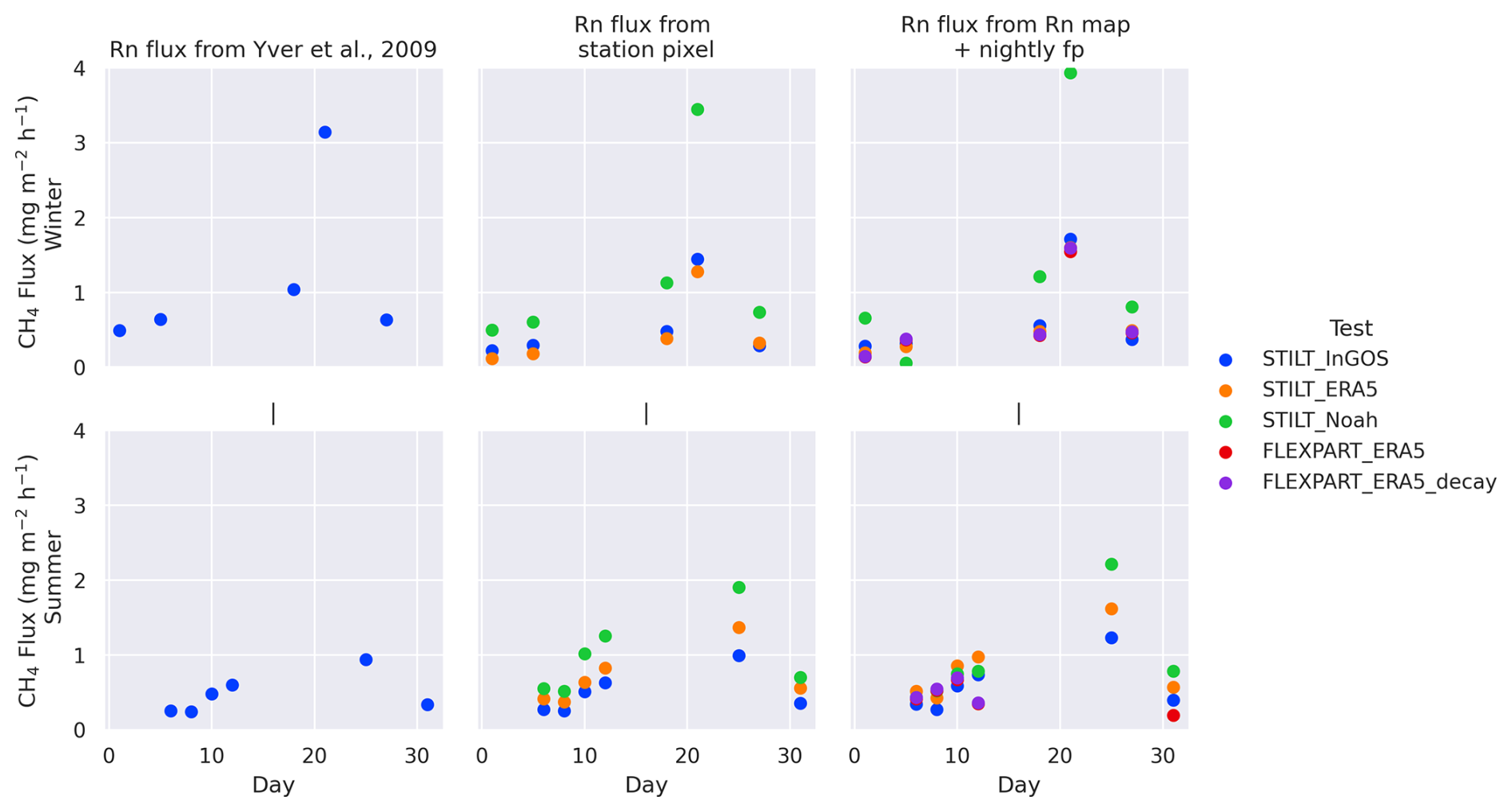 For the RTM runs (see Table 1), we used the three different radon exhalation maps available (called hereafter InGOS (climatology based on Karstens et al., 2015), traceRadon_ERA5, traceRadon_Noah), two models (CP-STILT, WRF-FLEXPART). By default, the two models do not compute the radon decay term. It is applied as a fixed term in the Eq. (3) as in Schmidt et al. (2001). For the last run, however, WRF-FLEXPART was modified to apply the Radon decay at each time step so the footprint already accounts for it. Not all combinations are tested but all runs can go in pairs, with only one change from one to the other. Two months were chosen: February 2019 and August 2019 to observe the seasonal influence and as months with a good data coverage for CH4.