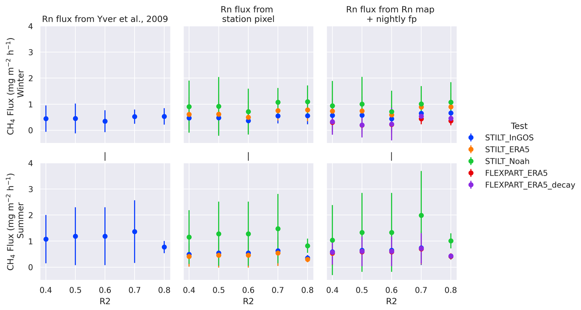 As can be expected, the variability on the radon fluxes is seen as well on the CH4 fluxes (see Fig. 6), reflecting that the day to day variation is due not only to the emission variations but also to the the different areas that are sampled. We observe values around 0.5 in winter and summer with more variability in summer. On 21 February, the values are particularly high compared to the other winter values, peaking at more than 3 when using STILT_Noah. On that day, the correlation is strong with an R2 at 0.76 and high concentration of CH4, CO2 and CO while the radon accumulation is small, just above the threshold. There is no rain but a wind direction change just at the beginning of the period form south-west to south-east that may have brought polluted local air masses.