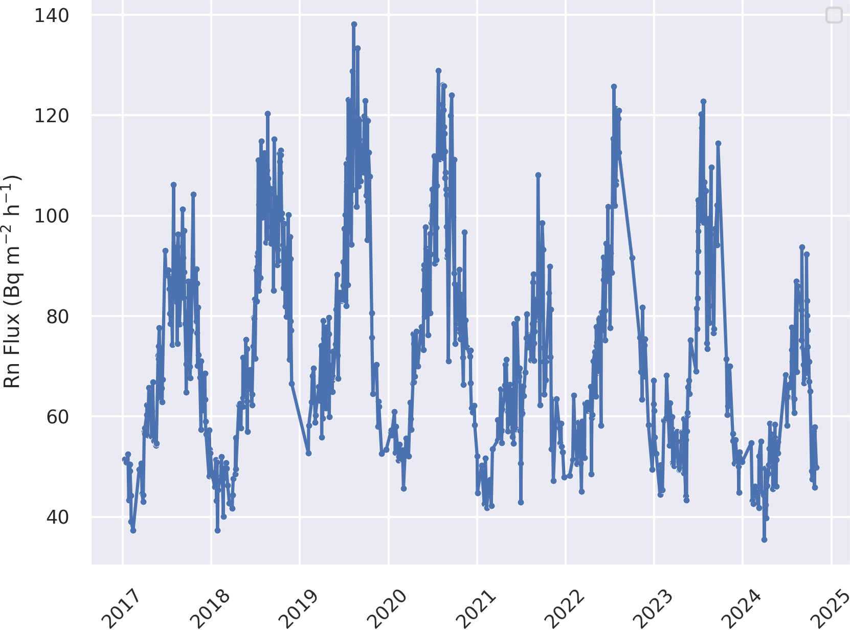 Routine radon monitoring at SAC is conducted at 2, 50 and 100 m above ground level (), while GHG are sampled at 15, 60 and 100 Various meteorological measurements are available at 0.1, 1.5, 60 and 100 The above data have been measured since 2015 for GHG and meteorological data and since the end of 2016 for 100 m radon measurements. On the ICOS Carbon portal, GHG are available from May 2017 (date of ICOS fully compliant data) and radon from December 2020. The RTM has previously been applied at the nearby site of Gif-sur-Yvette, 2 km west of SAC (Messager, 2007; Yver et al., 2009; Lopez et al., 2012; Belviso et al., 2013, 2020). Yver et al. (2009) summarized the radon flux estimates before 2009 made with flux chambers and showed that they were ranging 42–66 ± 22 with an average of 52 . In summer 2013, additional measurements were done and used to assess Karstens et al. (2015) radon exhalation rate map (Karstens et al., 2015). The values found for SAC for the direct measurements were 18–54 .The simulations yielded values in the same range. Footprints for the site using the Stochastic Time-Inverted Lagrangian Transport model (STILT) (Lin et al., 2003) are available on the ICOS Carbon Portal (https://stilt.icos-cp.eu/viewer/, last access: 14 November 2025) from 2014 until the end of 2023.