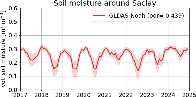 Figure 10Soil moisture content for the pixel containing SAC as modeled in GLDAS-Noahv2.1 from 2017 to 2025 with a porosity (noted por on the figure) of 0.439.