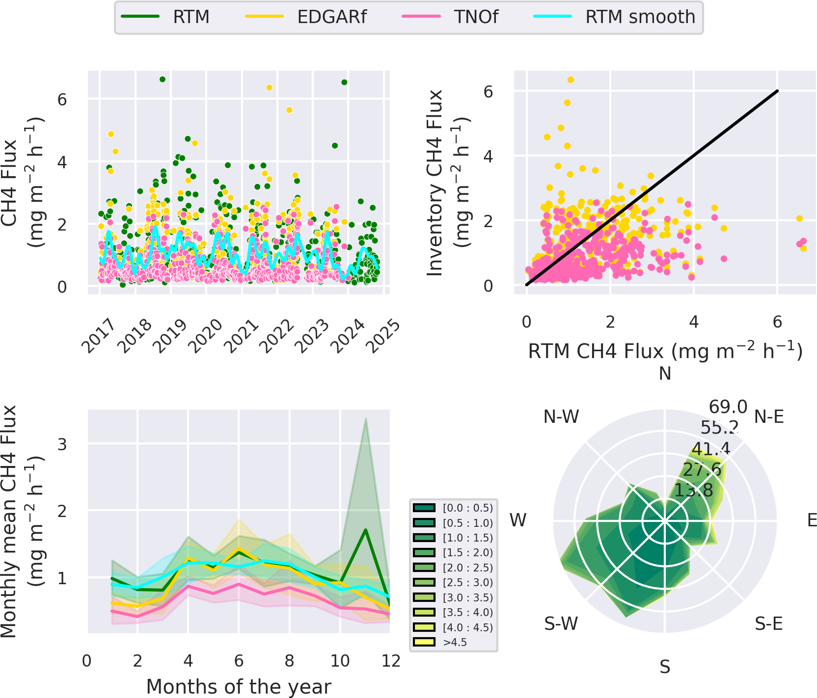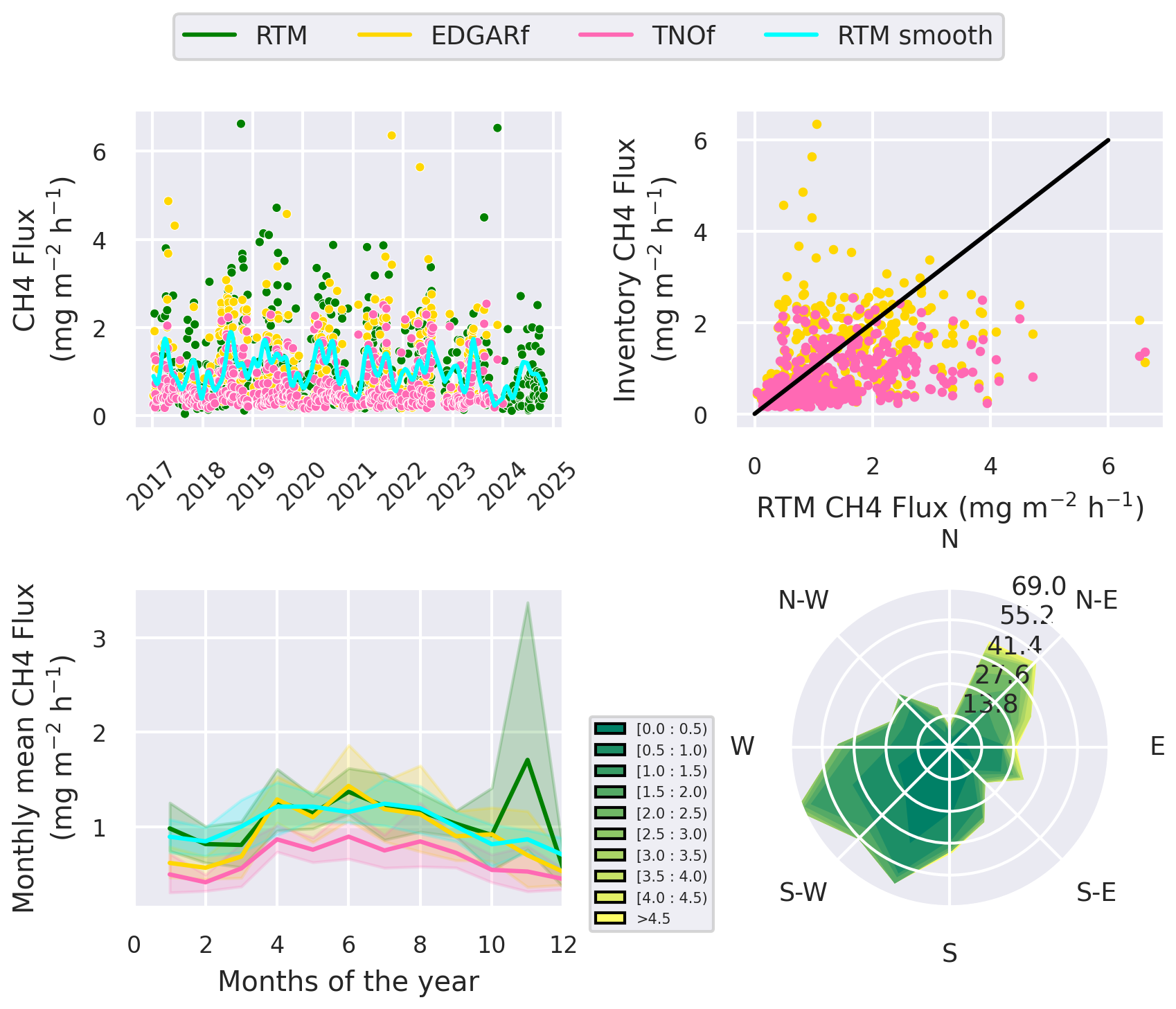 Figure 11The CH4 fluxes (RTM), calculated using the STILT_Noah configuration were compared with the smoothed fluxes (RTM smooth), the combined EDGAR and TNO inventories using the same footprints for the period 2017–2024 (EDGARf and TNOf, respectively). The top left panel shows all the selected nocturnal fluxes (colored dots), the top right panel shows the correlation between the RTM fluxes and the inventory estimates. The bottom left plot shows the seasonal cycles of the fluxes while the bottom right plot shows the flux repartition over the windrose with the flux intensity as the color scale and its frequency on the axial axe.