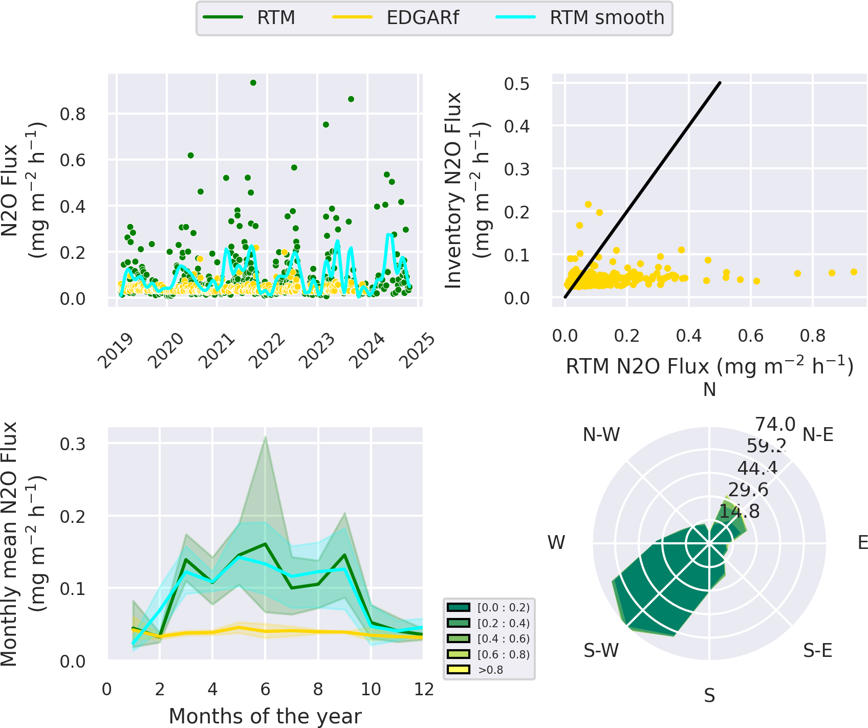 Figure 13The N2O fluxes (RTM), calculated using the STILT_Noah configuration were compared with the smoothed fluxes (RTM smooth), the combined EDGAR inventory using the same footprints for the period 2019–2024 (EDGARf). The top left panel shows all the selected nocturnal fluxes (colored dots), the top right panel shows the correlation between the RTM fluxes and the inventory estimates. The bottom left plot shows the seasonal cycles of the fluxes while the bottom right plot shows the flux repartition over the windrose with the flux intensity as the color scale and its frequency on the axial axe.