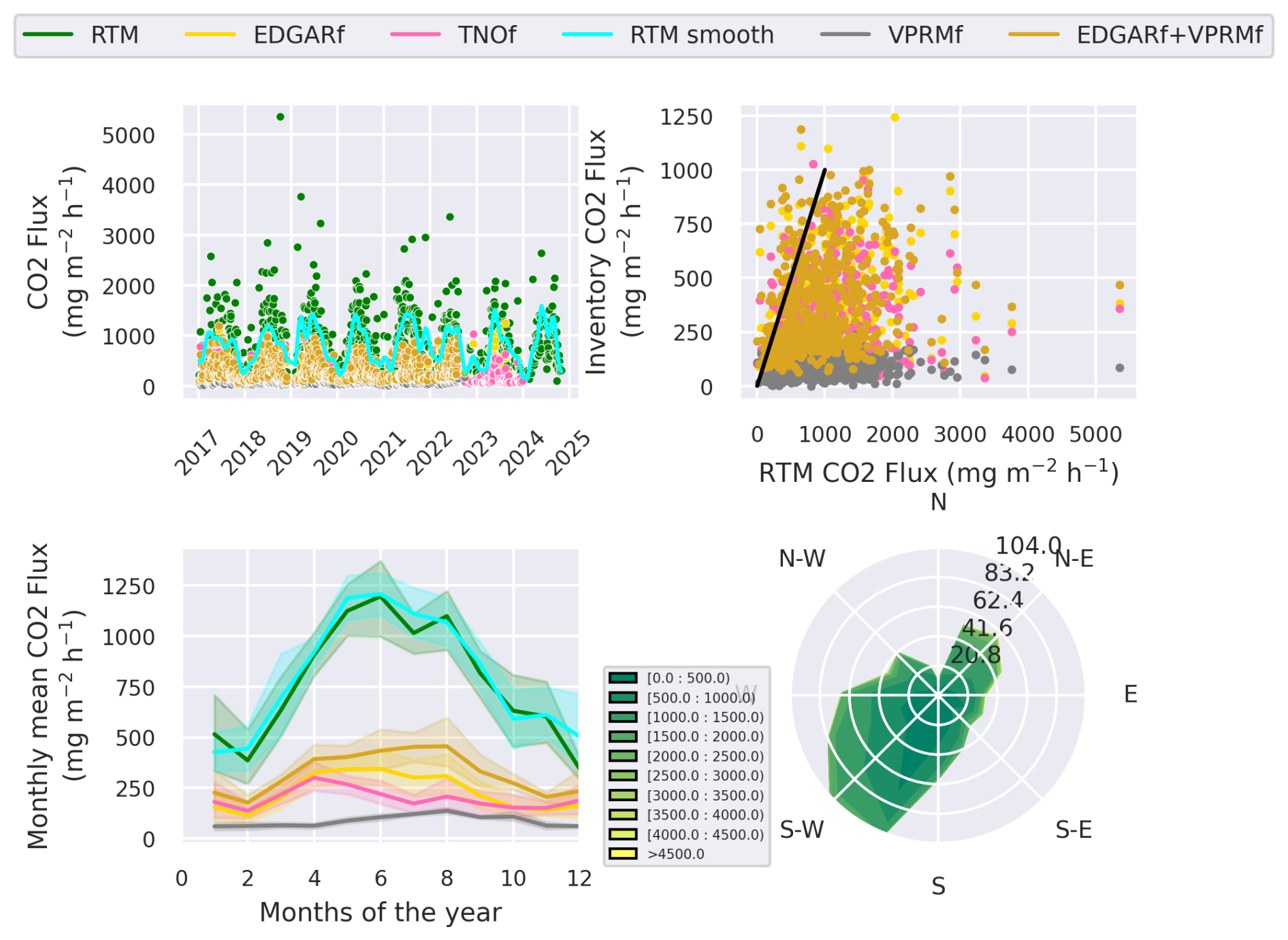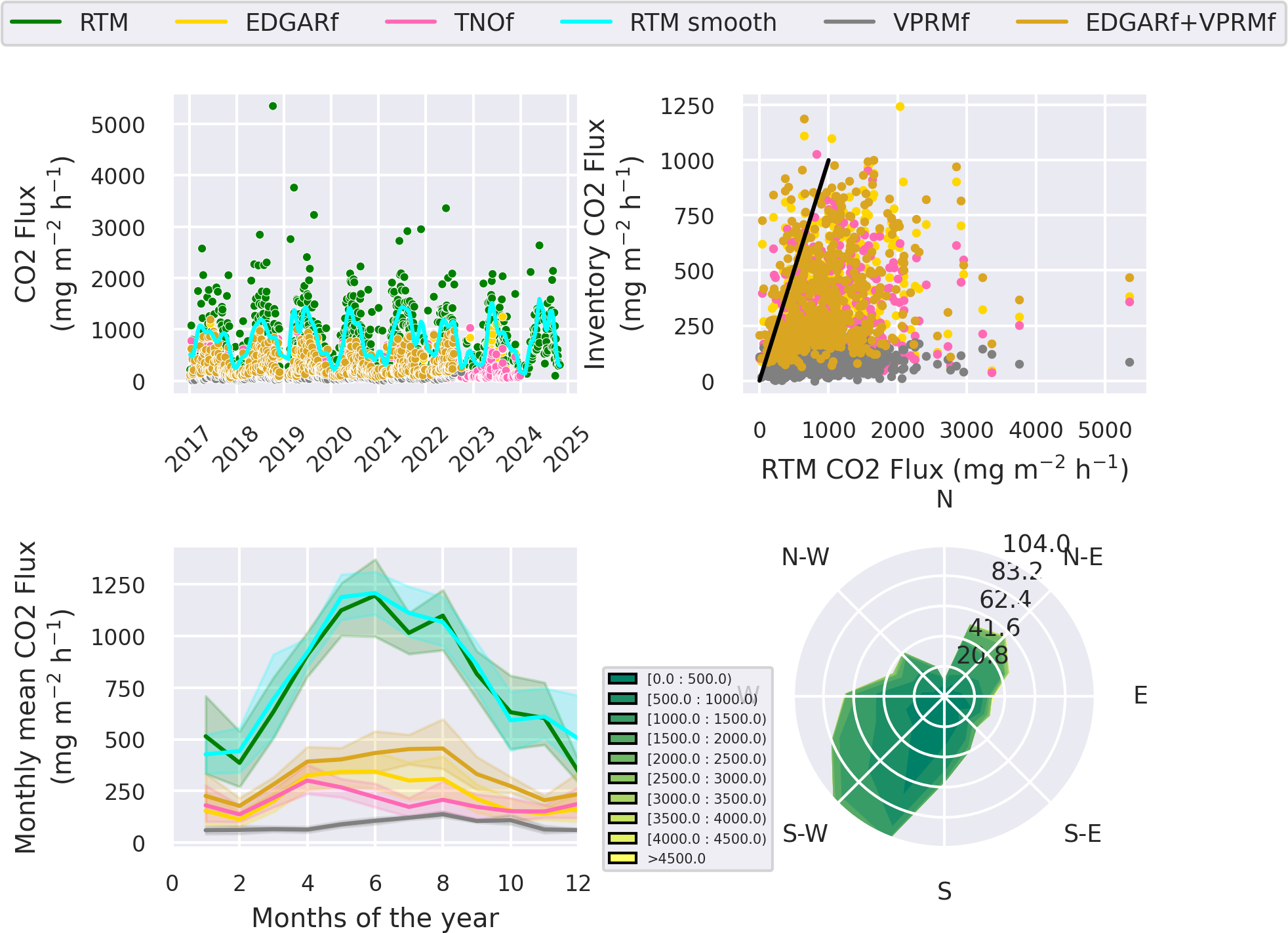 Figure 15The CO2 fluxes (RTM), calculated using the STILT_Noah configuration were compared with the smoothed fluxes (RTM smooth), the combined EDGAR, TNO and VPRM inventories using the same footprints for the period 2017–2024 (EDGARf, TNOf and VPRMf, respectively). The top left panel shows all the selected nocturnal fluxes (colored dots), the top right panel shows the correlation between the RTM fluxes and the inventory estimates. The bottom left plot shows the seasonal cycles of the fluxes while the bottom right plot shows the flux repartition over the windrose with the flux intensity as the color scale and its frequency on the axial axe.