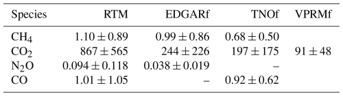 Table 2GHG fluxes () averaged over the measurement period (2017–2024 or 2019–2024) for the RTM estimates fluxes using the STILT_Noah configuration, for EDGARf, TNOf and VPRMf estimates. The second value represents the standard deviation over the whole period.