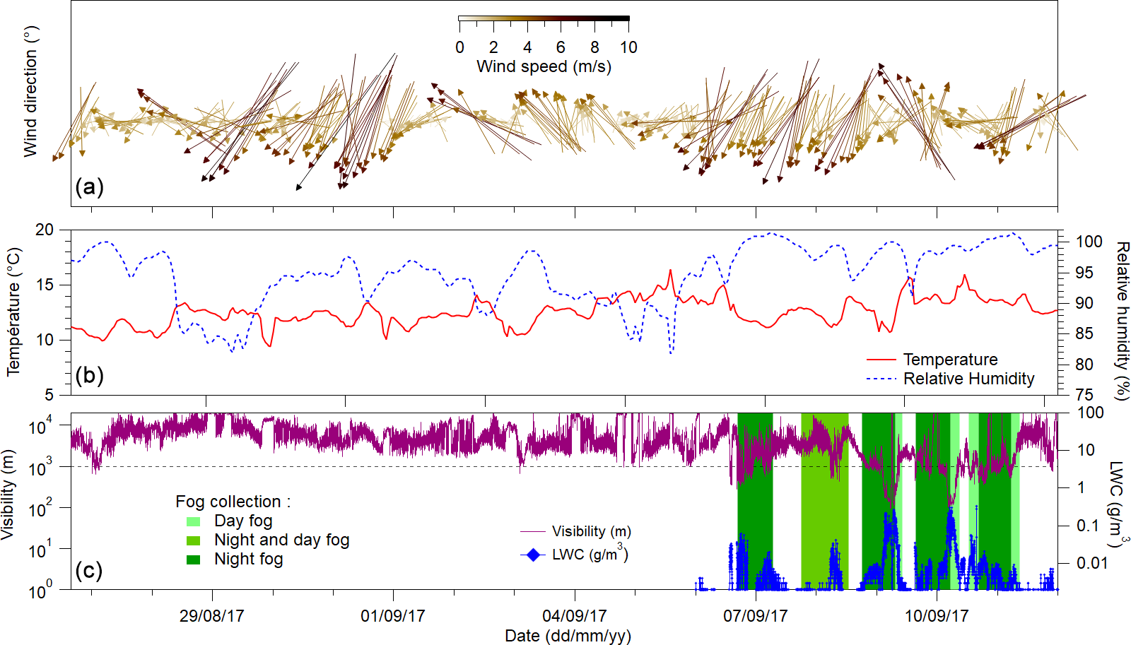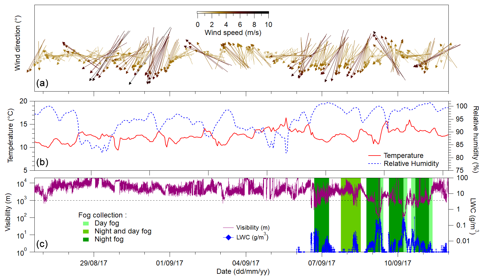 Figure 1Time series of wind direction and speed (a). Hourly average relative humidity and temperature (b). Visibility and liquid water content (LWC) of the fog (c). The green shades in panel (c) correspond to the fog collection periods. Fog events are generally classified as visibility<1 km.