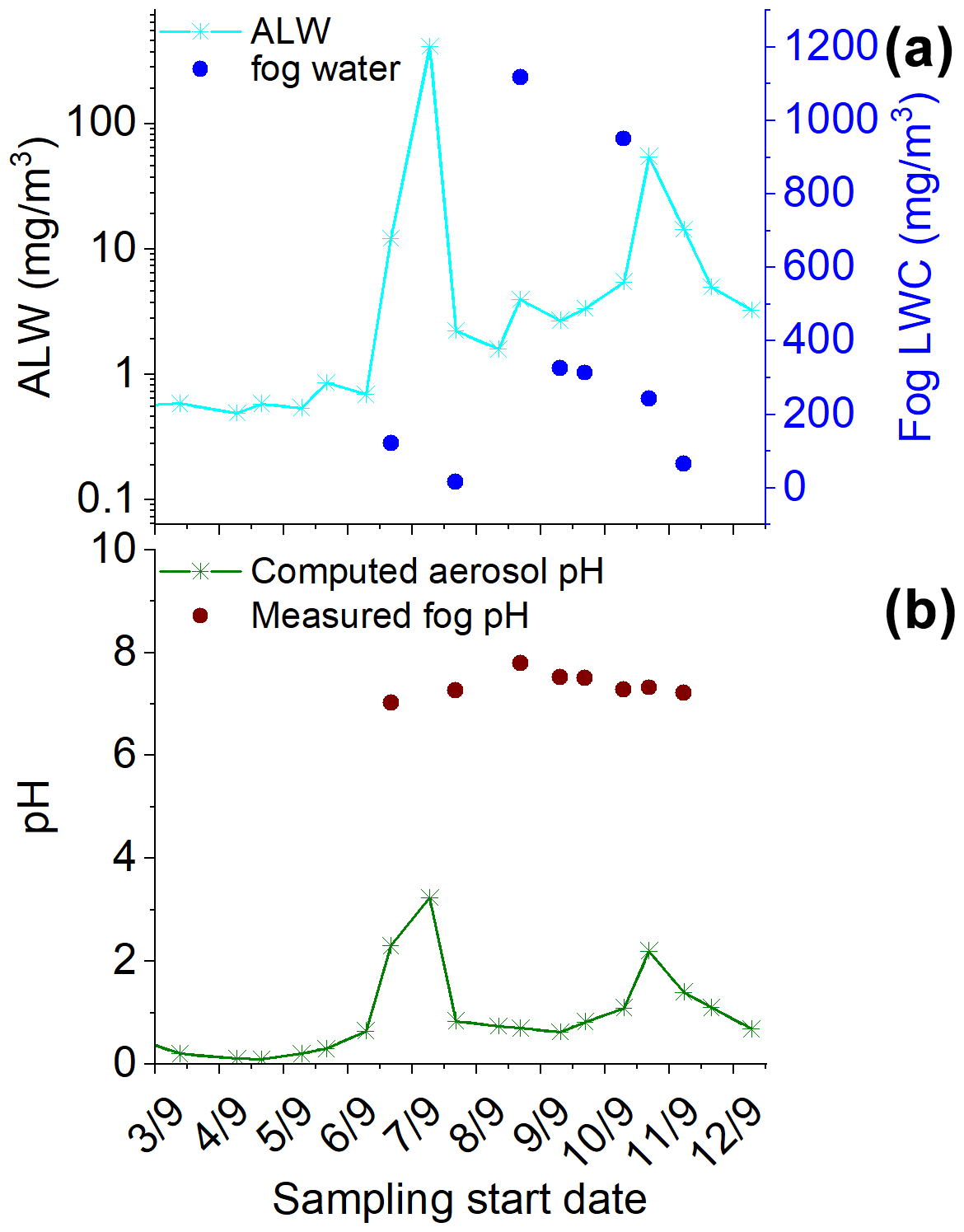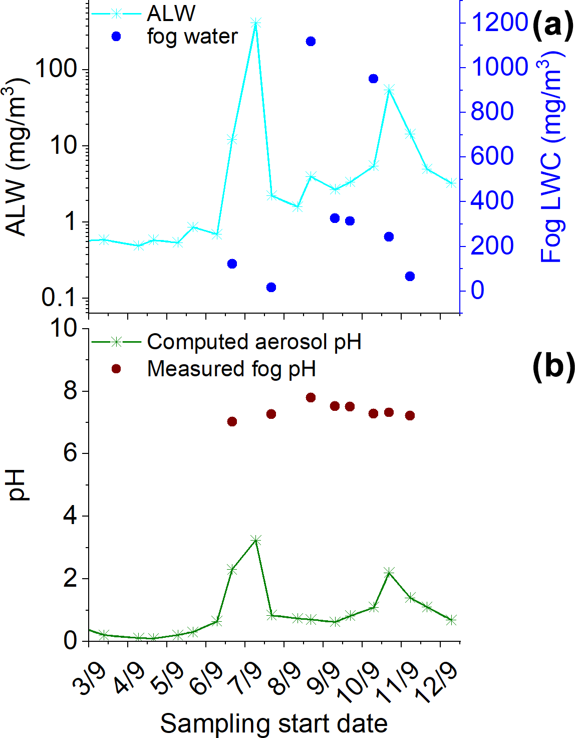 Figure 2Time series of (a) aerosol liquid water (ALW) content calculated with E-AIM and measured fog LWC retrieved from the measured water collected with the CASCC sampler and (b) pH in aerosol calculated with E-AIM and measured pH in fog. Fog samples H1001 and H1002 have been averaged over the TSP sample S-34 collection time. The TSP samples reported here are those corresponding to sample IDs S20 to S38.
