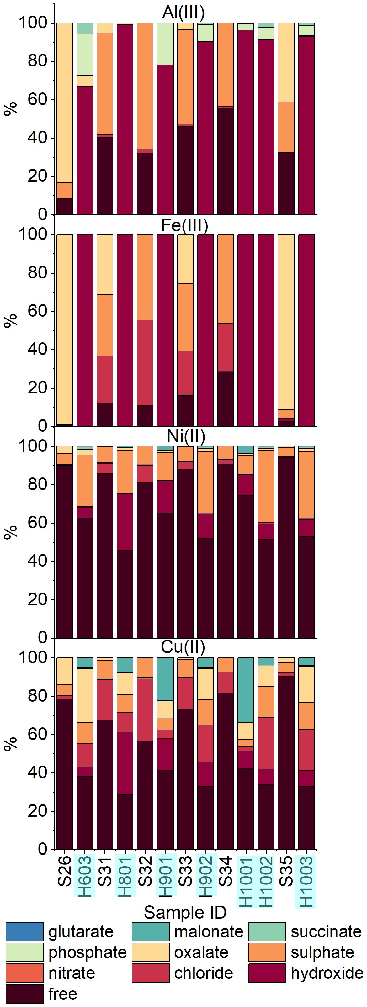 Figure 3Comparison of the detailed speciation of dissolved metals in TSP (sample IDs starting with “S”) and fog (sample IDs starting with “H”) for (top to bottom) Al(III), Fe(III), Ni(II), and Cu(II). Samples collected at approximately the same time are shown side by side. The sampling of TSP sample S34 covered the same times as both the H1001 and H1002 fog samples.