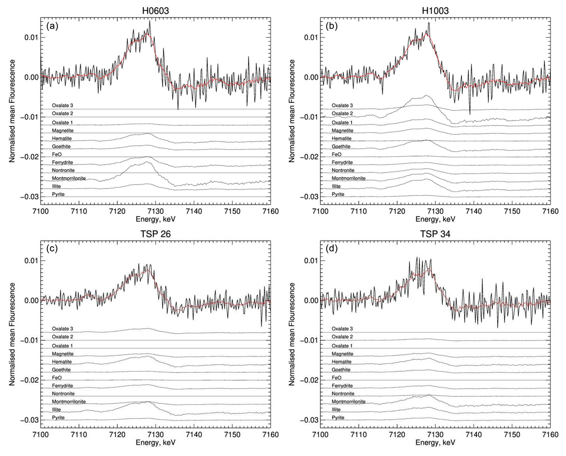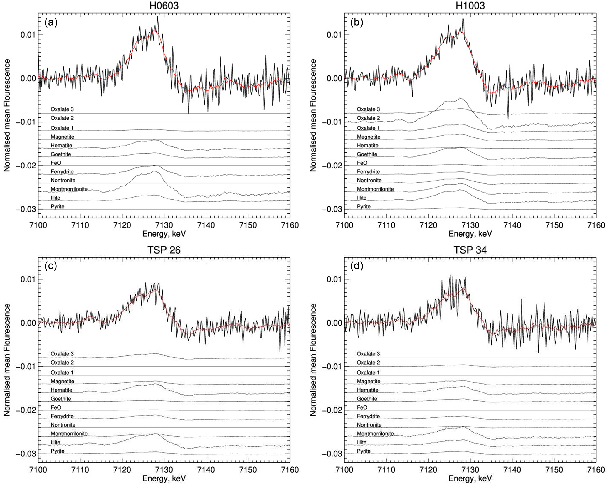 Figure 5XANES spectra at the FeK edge for two fog samples (top, H0603 and H1003) and two TSP samples (bottom, TSP 26 and TSP 34) showing the results of the spectral deconvolution using a linear combination fitting with Fe measured reference standards of oxides, clays, organic complexes, and sulfide. The individual contributions of the references to the total fit (red curve) are represented as stacked black lines. For the sake of clarity, the contributions of organic complexes (named “oxalate 1” for Fe(C2O4)2H2O, “oxalate 2” for (NH4)3[Fe(C2O4)3], and “oxalate 3” for Fe2(C2O4)36H2O in the figure) are multiplied by 10.