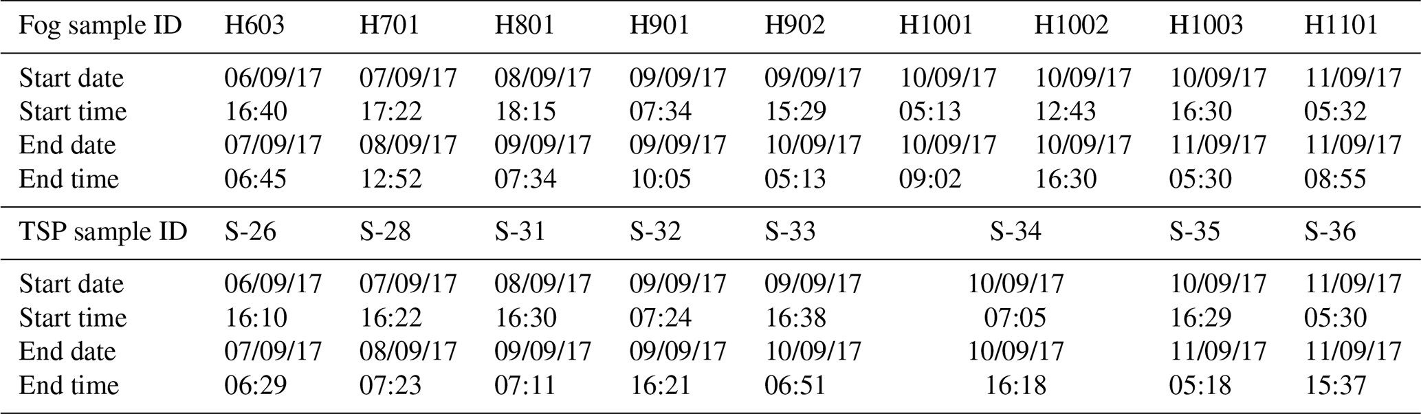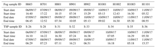 Table 1Dates and times of collection of concurrent aerosol and fog samples in Henties Bay during the AEROCLO-sA campaign in September 2017. Dates are reported as “dd/mm/yy”, time is in UTC.