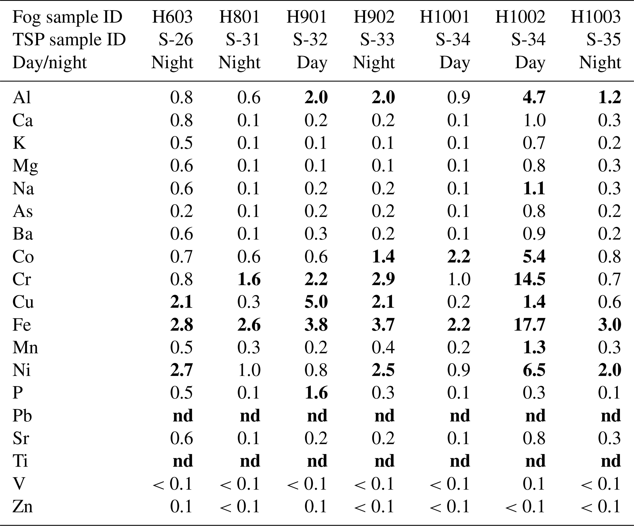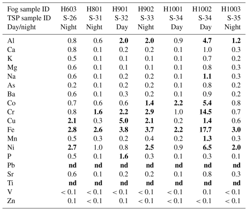 Solubility of metals in TSP samples is discussed for the whole campaign in Formenti et al. (2025). Here, we focus the discussion on the comparison between dissolved metals in pairs of TSP and fog samples. For the comparison, fog water-dissolved metal concentrations (µM) were transformed into air concentrations (ng m−3) using the liquid water content (g H2O m−3). This allows for comparison of fog concentrations with dissolved metal concentrations in TSP samples. The ratio of fog concentrations to TSP concentrations is shown in Table 3. When concentrations of dissolved metals in TSP samples are compared with concentrations in fog concurrently collected, higher concentrations of Al, Fe, Cu, and Ni are found in fog (Table 3). The Al, Fe, Cu, and Ni concentrations in fog are up to a factor of 4.7, 17, 5, and 6.5 higher than dissolved concentrations in TSP samples. Similarly, the Cr concentration in fog was up to 14.5 times higher than the dissolved concentration in TSP samples and Ti was detected in fog but not in the corresponding samples of the dissolved fractions of TSP samples.
