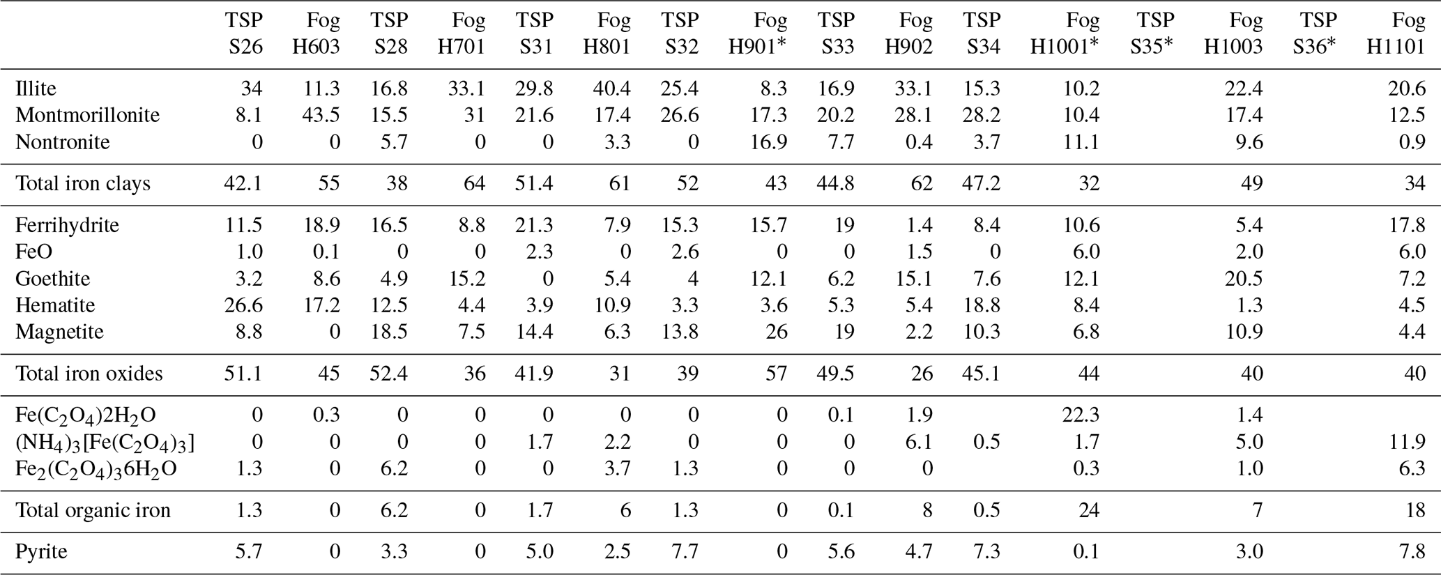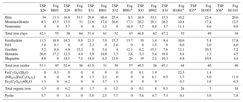 Iron speciation was measured experimentally in order to elucidate the processes that may increase iron solubility in the fog samples compared to the TSP samples. Table 4 and Fig. 5 show the results of the linear combination fitting of the XANES spectra of the TSP and fog samples using reference spectra that are representative of various iron oxides, clays, pyrite, and complexes with oxalate formed by either Fe(II) or Fe(III). The results show that, for both TSP and fog samples, iron oxides and clays are by far the major components, as expected for samples affected by the transport of mineral dust. In the case of TSP, iron oxides and hydroxides contribute 39 %–52 % and iron clays contribute 38 %–52 % (Table 4), making the majority of Fe insoluble. In fog samples, the contributions of these two classes of minerals are more variable, with iron oxides and hydroxides contributing 27 %–56 % and iron clays contributing 32 %–64 % (Table 4). Iron-oxalate complexes, in particular those of Fe(III), contributed to some samples of both TSP and fog. Excluding samples that were close to the detection limit or affected by diffraction, iron oxalate contributed up to 6 % in TSP samples and up to 8 % in fog samples. Pyrite was found to contribute up to 7.8 % of the total iron concentration, which was attributed to the transport of fugitive dust from smelting areas (Formenti et al., 2025).