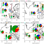 Figure 12Trajectory clusters representing 72 h back-trajectories simulated by HYSPLIT4 for each season at the Jülich site, annotated with the frequency proportions of each respective cluster. Additionally, the average composition and concentration of submicron aerosols, together with the average source contributions of organics derived from PMF analysis, are presented for each corresponding cluster period.