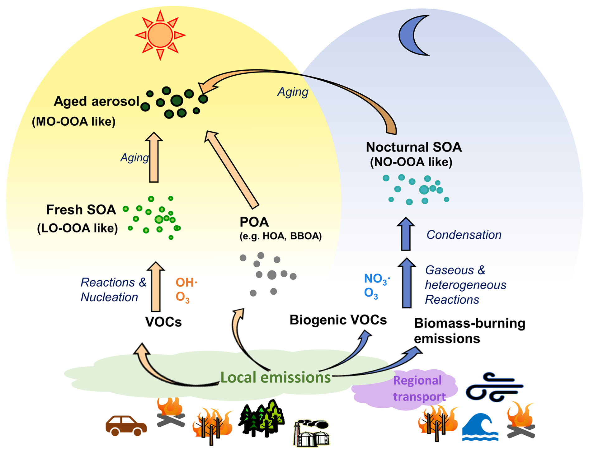 Figure 1Overview of sources and evolution processes of OA identified in this study.