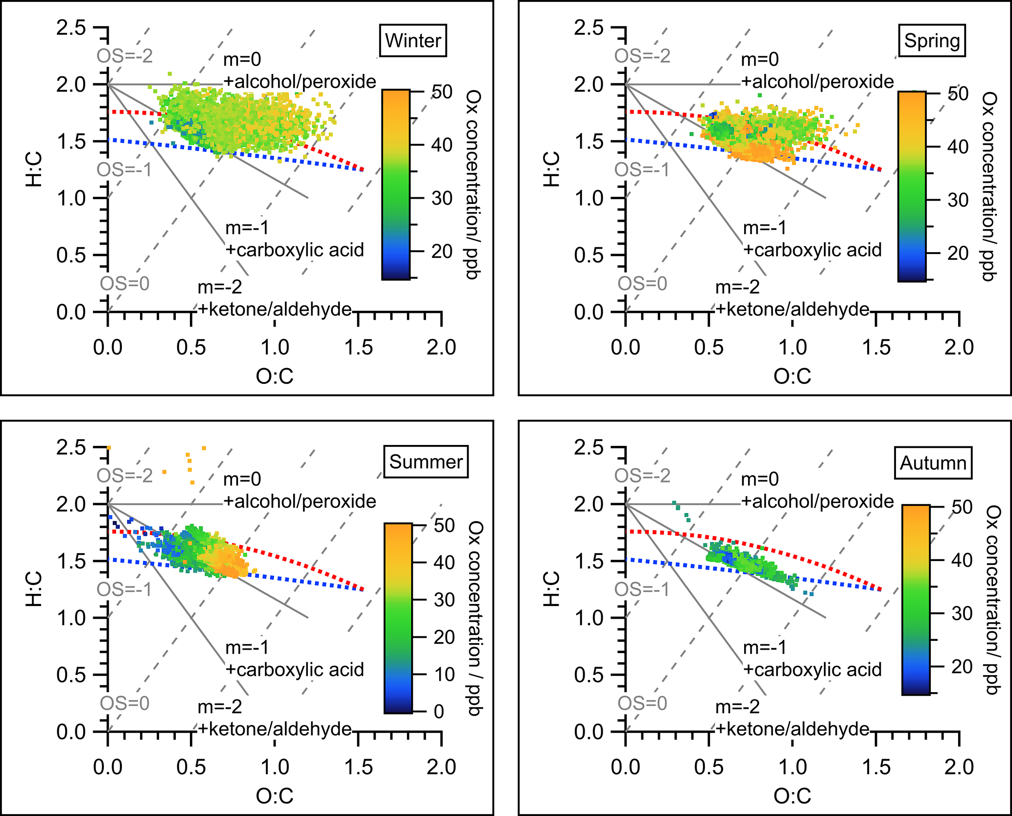 Figure 2Van Krevelen triangle graph for all measurements of OA during the four seasons of the JULIAC campaign. Atomic ratio regions of standard groups for alcohol/peroxide, carboxylic acid, and ketone/aldehyde (Aiken et al., 2007) were marked as references. The dots in all graphs were color-coded by the concentration of the oxidant Ox (NO2+ O3) to represent the intensity of secondary oxidation. The red and blue dashed line corresponds to the right and left lines of the f44/f43 triangle introduced in Ng et al. (2010), representing the lower oxidation level (like POA) and higher oxidation level (like SOA), respectively. The estimated carbon oxidation states (OSc  2O/C-H/C) were marked as gray dashed lines. An overview of the averaged elemental ratios O:C, H:C, and OSc with corresponding standard deviations of total OA for the four JULIAC intensive phases is given in Table S7.