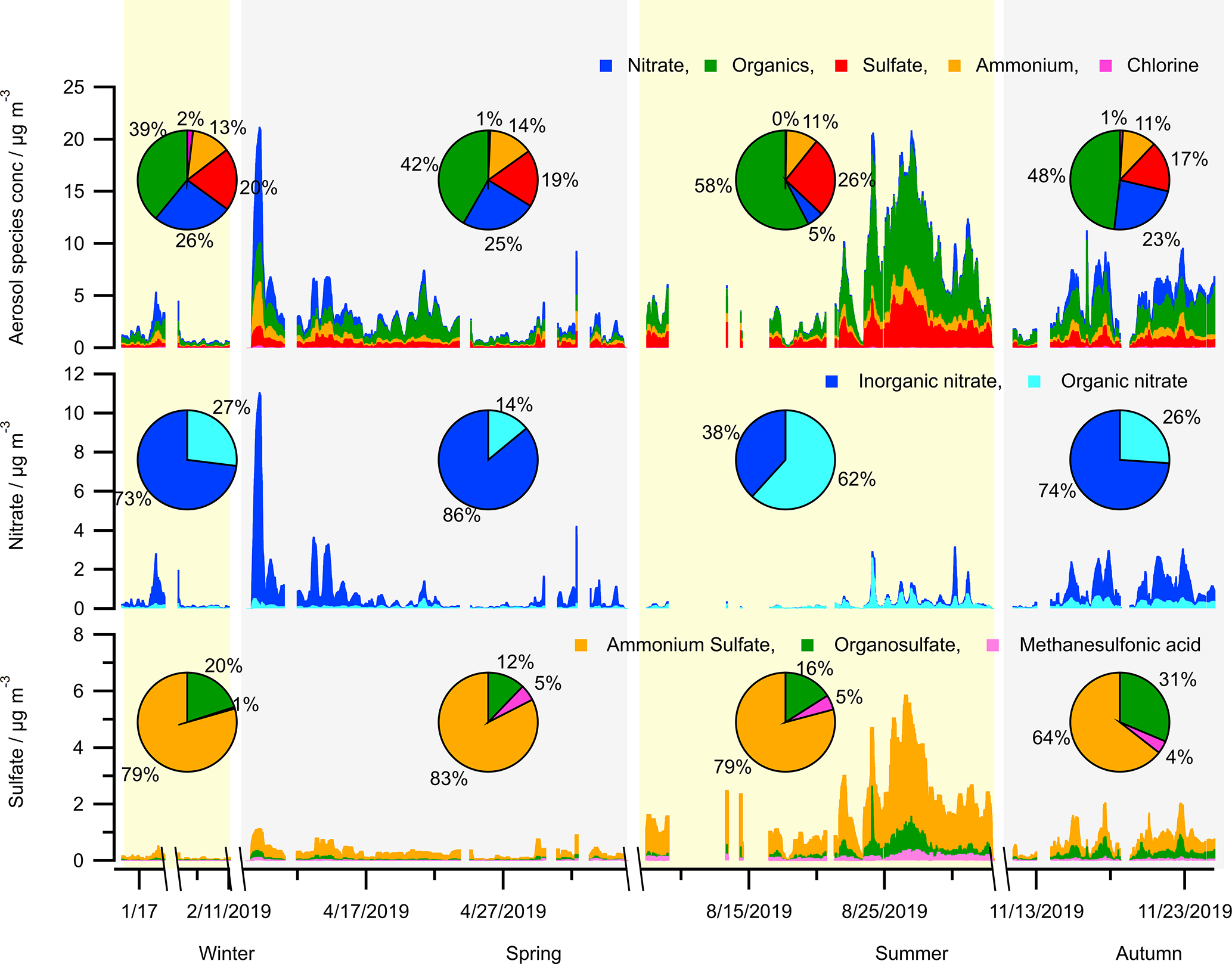 Figure 3Seasonal variation in the concentrations of aerosol bulk components (organics, sulfate, nitrate, ammonium, chlorine) and calculated concentrations of species (organic nitrate, organosulfate, methanesulfonic acid) from HR-ToF-AMS measurements.