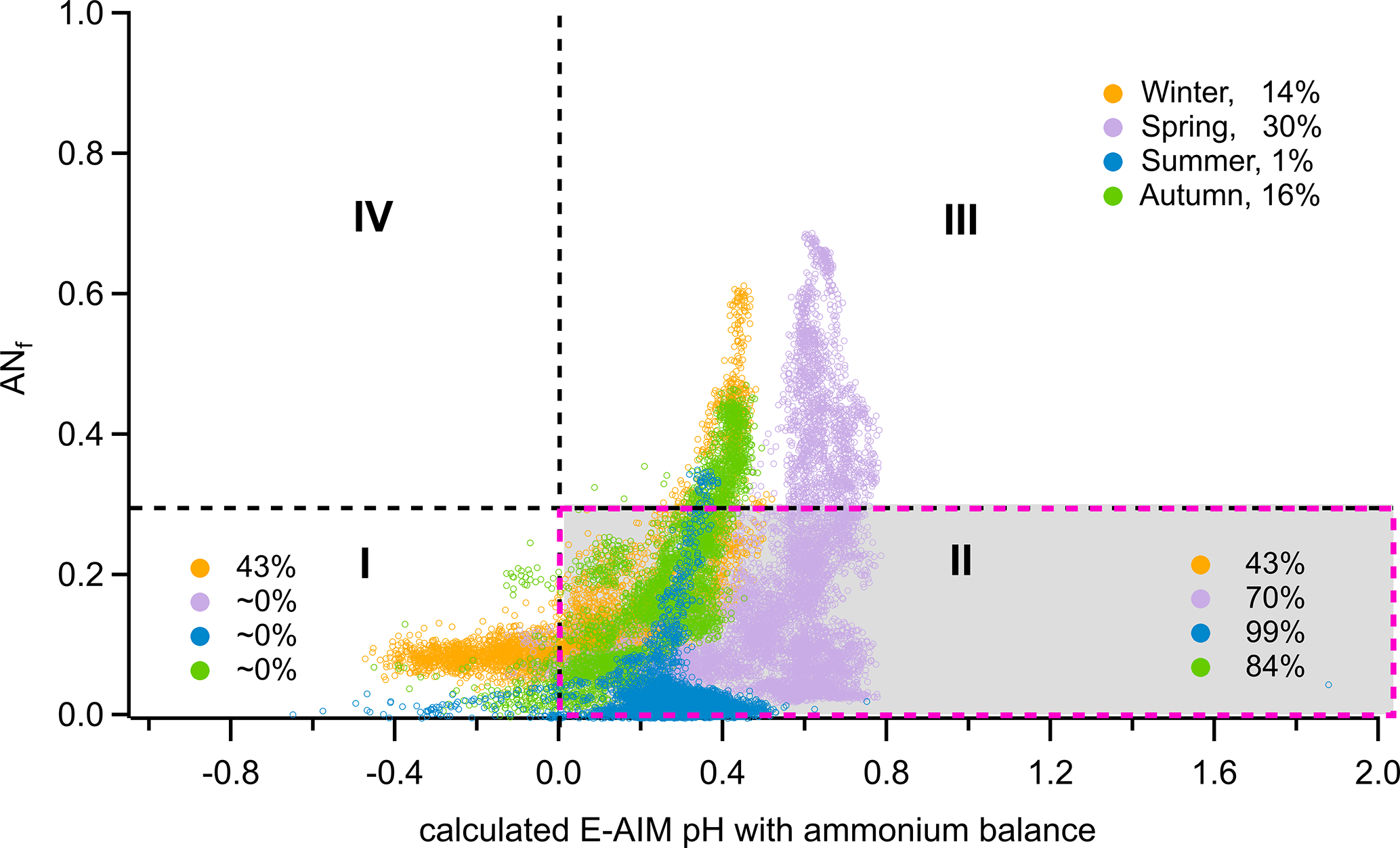 Figure 4Distribution of aerosol data points measured during the four seasons of the JULIAC campaign for chemical conditions defined by the ammonium nitrate mass fraction (ANf) and the pH predicted by the Extended Aerosol Inorganics Model (E-AIM) as established by Schueneman et al. (2021). The E-AIM pH was estimated from the measured ammonium balance using HR-ToF-AMS via the empirical calculation method introduced by Schueneman et al. (2021). For all seasons, the fractions of data points under the four conditions were calculated and displayed within the corresponding areas.