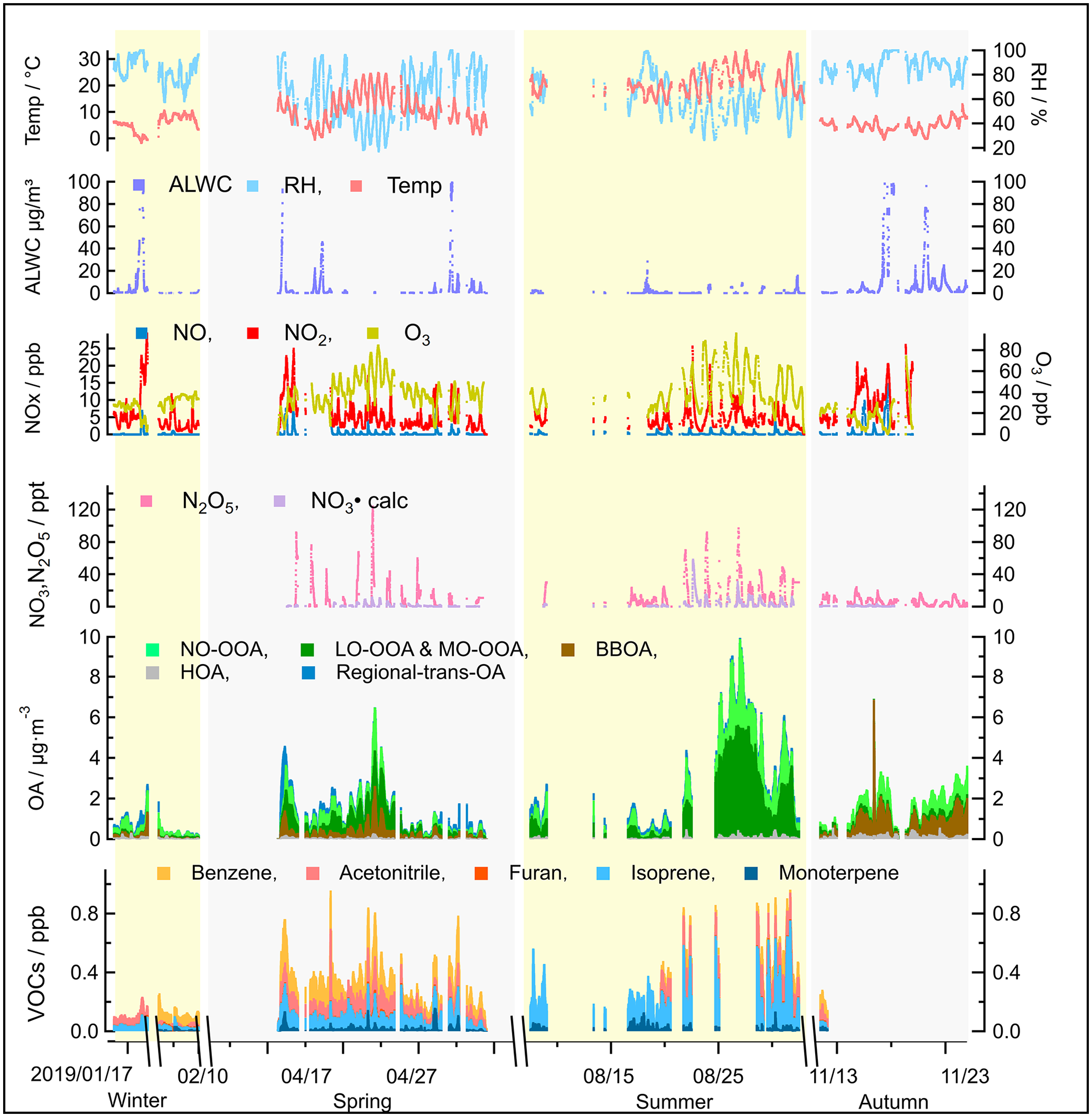 Figure 5Overview of seasonal variations in source contributions derived from the PMF analysis of OA measurements, including supporting ambient measurements that can be used to identify sources, such as ALWC, trace gase concentrations (VOCs, O3, NOx, N2O5, NO3 radicals), and meteorological parameters (temperature and RH), measured during the JULIAC campaign.