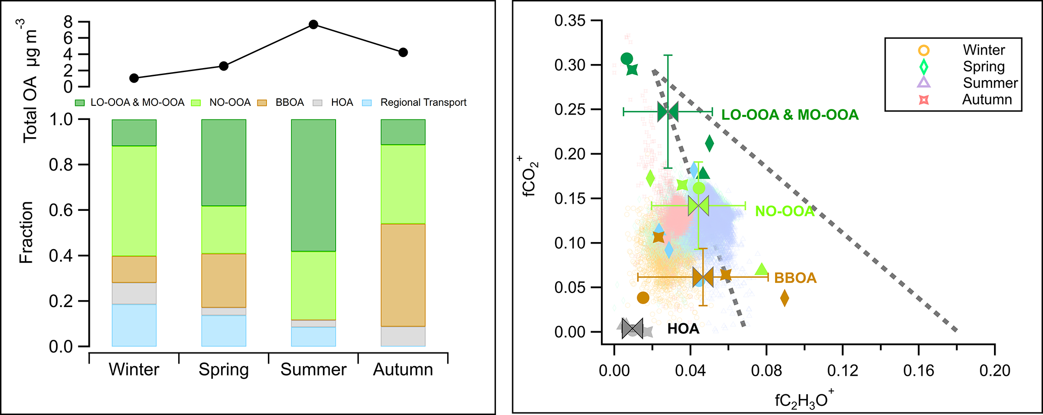 Figure 6Left panel: Comparison of the average total mass concentration of OA measured by HR-ToF-AMS and the mass fraction of primary and secondary sources' contributions to OA during the JULIAC campaign. Right panel: fCO2+ (fraction of fragment CO2+ in OA) vs. fC2H3O+ (fraction of fragment C2H3O+ in OA) for all OA during the JULIAC campaign (small transparent dots). The OA source factors (including LO-OOA, MO-OOA, NO-OOA, BBOA, HOA, and regional transport factors) resolved by PMF during each season are shown in fCO2+ vs. fC2H3O+ space (the marker types representing the different seasons, the marker color stands for factor type). Mean values and standard deviations for these four types of source factors are also displayed. The coarser dashed lines represent the f44/f43 distribution triangular region of ambient OOA factors reported in Ng et al. (2010), where f44/f43 corresponds to the mass to charge ratio of CO2+ (m/z 44) to C2H3O+ (m/z 43).