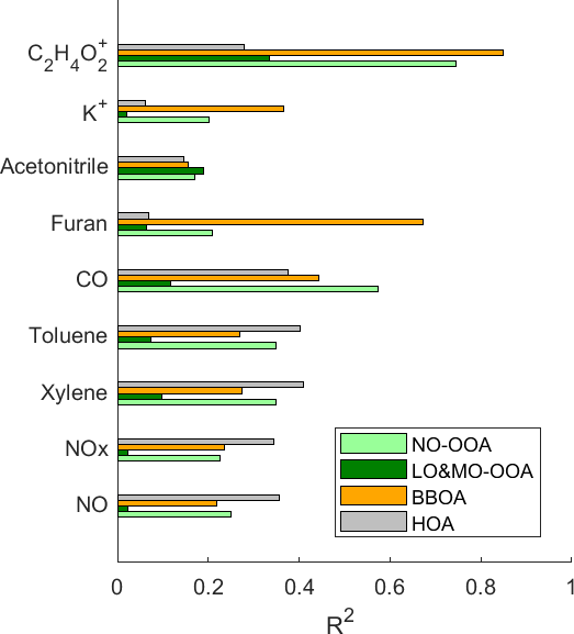 Figure 7Cross-correlation R2 of major OA sources among tracer gases of car exhaust (NO, NOx, xylene, toluene), trace gases of combustion and biomass-burning (CO, furan, acetonitrile), and characteristic aerosol fragments of biomass-burning (K+, C2H4O2+). OA regional transport factors are not shown due to their extremely low correlation with all primary emission tracers.