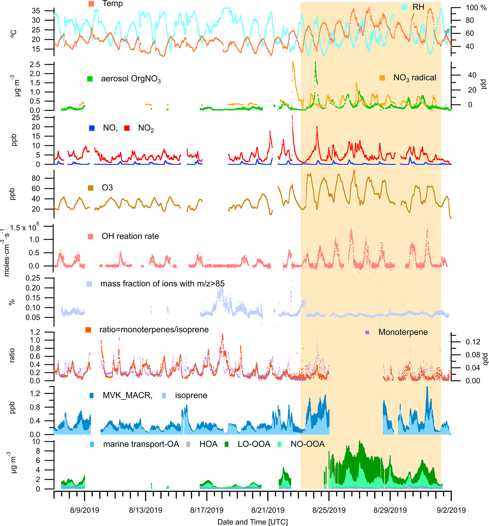 Figure 13An overview of OA source contributions, ambient measurements of trace gases (VOCs, O3, NOx, N2O5, NO3 radicals), meteorological parameters (temperature and RH), and calculated parameters are provided for the JULIAC summer period. The calculated parameters include the OH reaction rate (derived from measured OH concentrations and OH reactivity), the mass fraction of ions with m/z>85 in OA measured by the ToF-AMS, and the concentration ratio of monoterpenes to isoprene. The period of the heatwave event observed in summer is highlighted with a yellow background.
