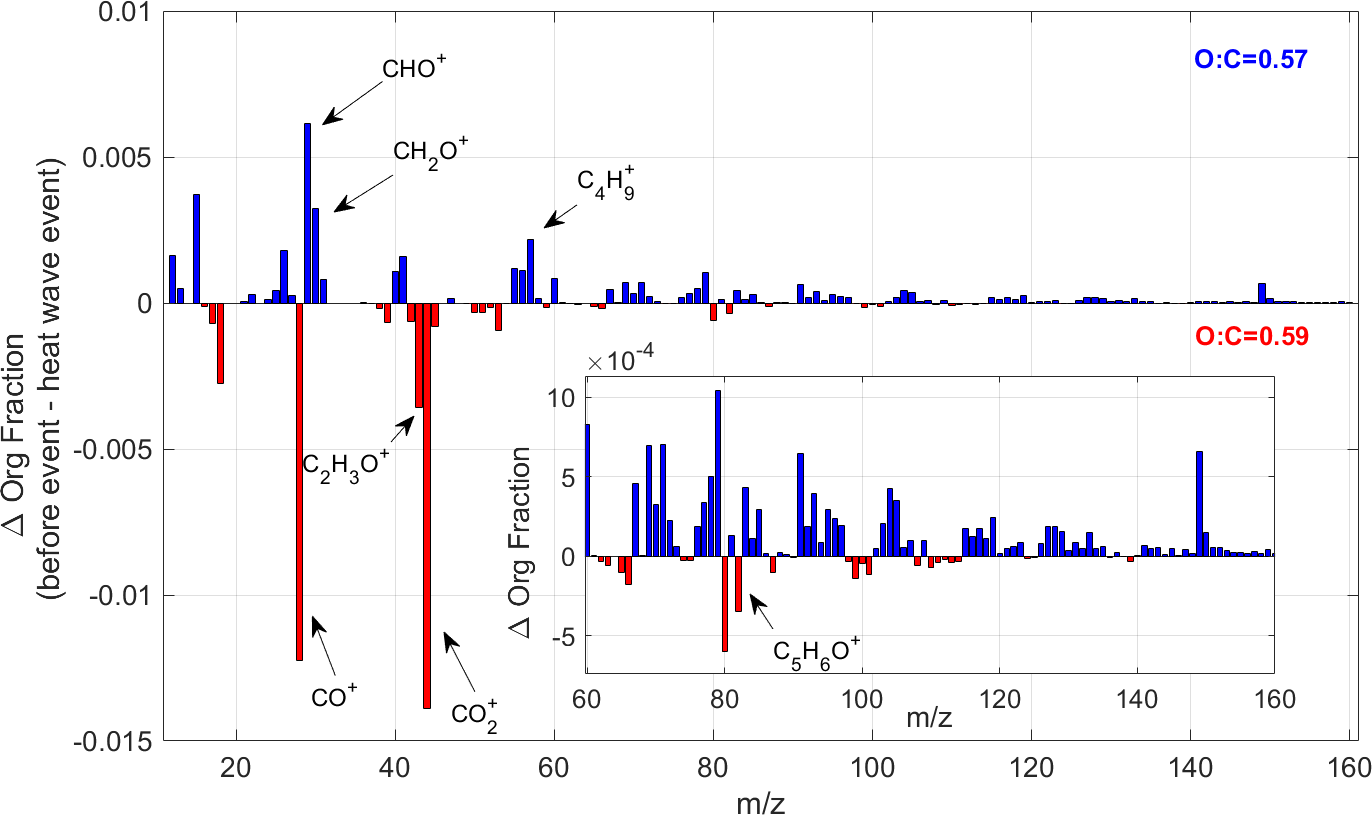 Figure 14The change in the average organic signal mass fraction, normalized to total OA mass, between pre-heatwave and heatwave periods. The insert window shows the detailed mass spectrum difference at regions of higher molecular weight with m/z>60. The blue color bar shows the ion peaks, which have a higher intensity before the heatwave event, while the red color bar represents the ions enhanced during the heatwave event.