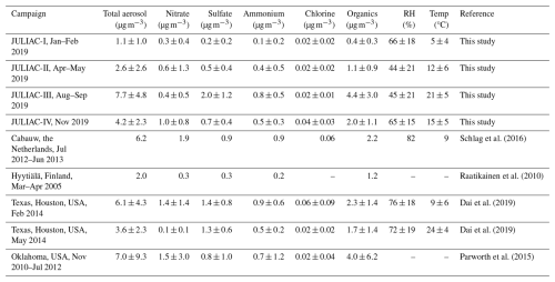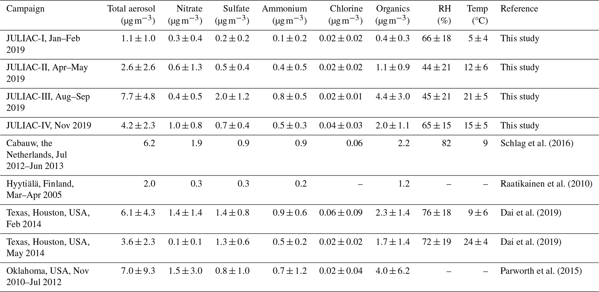 Table 1Overview of the seasonal average concentrations of components of submicron aerosol measured by HR-ToF-AMS, together with atmospheric conditions (RH, and ambient temperature) during the four JULIAC intensive phases, compared with previous field observations.