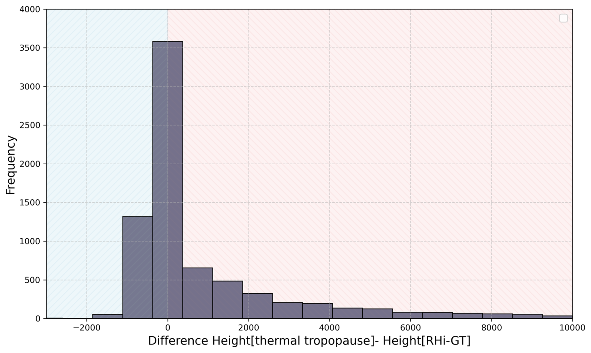 After considering some individual cases, the differences in the tropopause heights in the period under consideration are now discussed. The histogram in Fig. 4 is designed in a way that negative values indicate a RHi-GT higher than the thermal tropopause. Positive values, on the other hand, indicate a RHi-GT lower than the thermal tropopause, respectively.