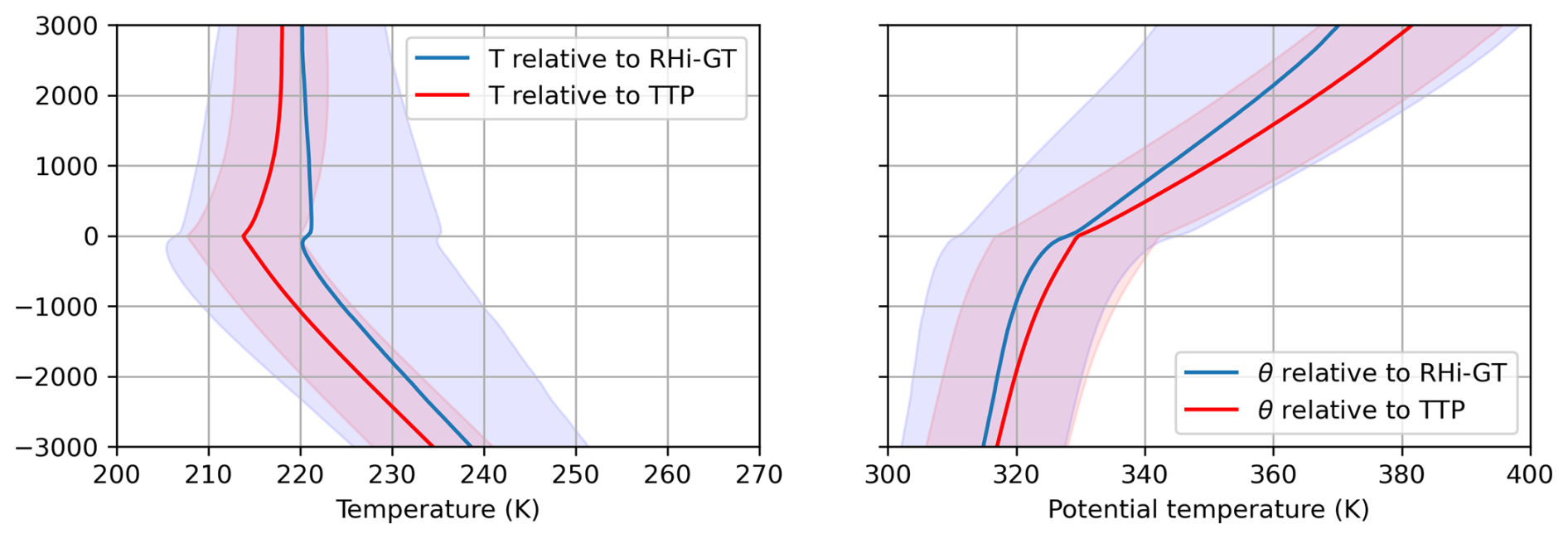 Figure 6Mean of the (left) absolute temperature and (right) potential temperature relative to the tropopause. Blue color denote the results for the RHi-GT, while red colors denote the results relative to the TTP. Shading denotes the range of the standard deviation.