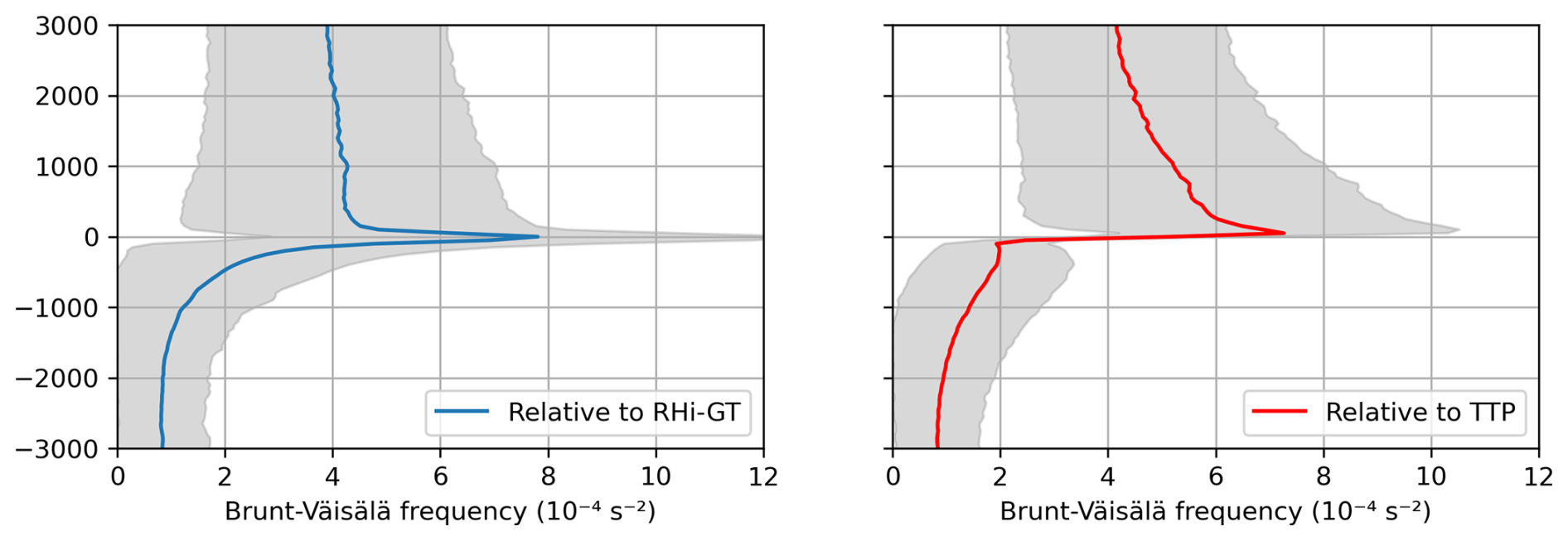 Figure 7Mean of Brunt-Väisälä frequency squared N2 for (left) relative to the RHi-GT and (right) relative to the thermal tropopause. Shading denotes the range of the standard deviation.