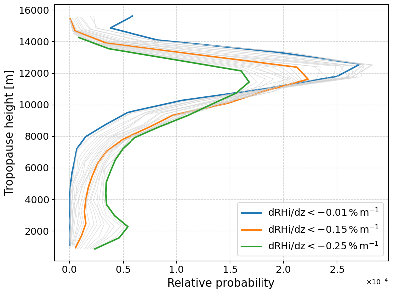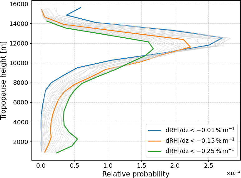 Figure 9 shows a histogram of the tropopause height for different vertical RHi gradients from −0.01 % m−1 to −0.25 % m−1 in steps of −0.01 % m−1. The weakest (blue) and strongest gradients (green) are highlighted as well as the value of −0.15 % m−1 used for the previous investigations in this study.