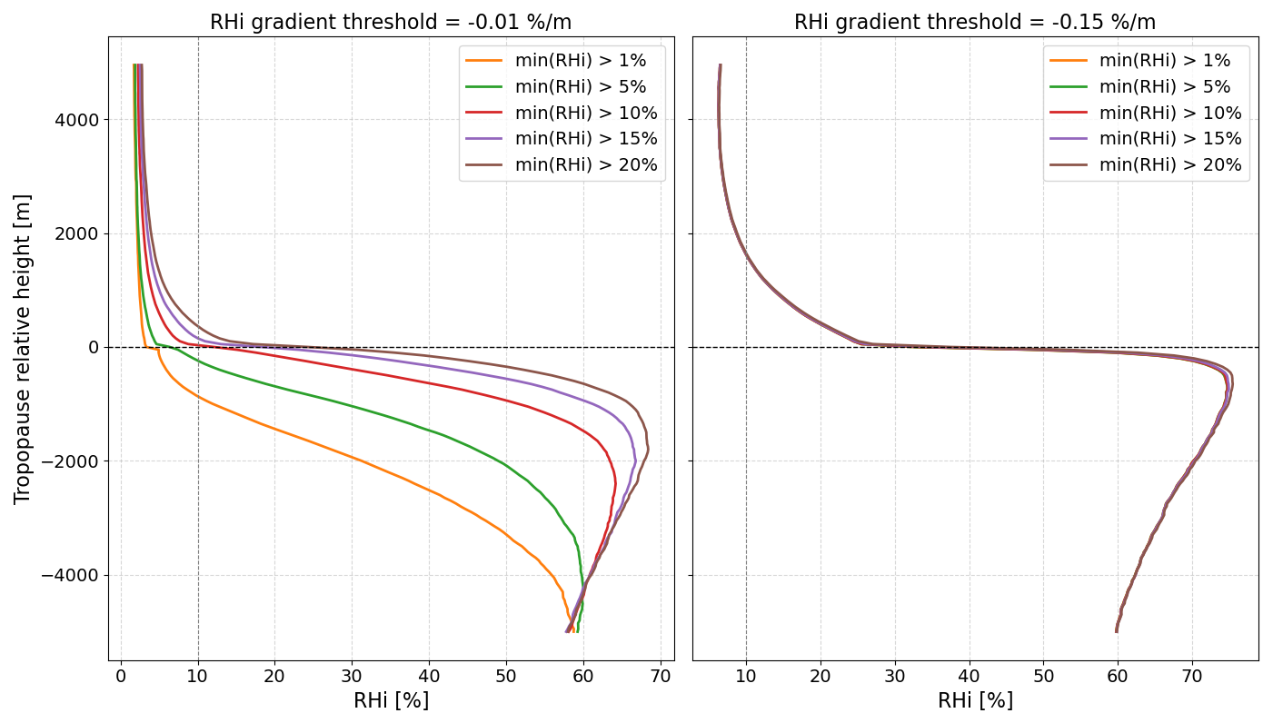 The other criterion for determining the tropopause height was the condition that RHi is above a threshold value of RHi = 10 %. Here, the results were also analyzed to determine how robust they were in relation to the choice of this threshold value. Figure 10 shows the vertical profiles of RHi. The left panel shows the results for a very weak vertical RHi gradient, while the right panel shows the results for the RHi gradient that was also used for the results in this study. It is clear to see that in the case of the very weak RHi gradient, the results, here the RHi profiles, depend very much on the choice of the minimum RHi value. In contrast, the results for a vertical RHi gradient threshold of −0.15 % m−1 indicate that the choice of a minimum RHi value has a negligible impact. Nevertheless, applying a minimum RHi value can be useful in practice to account for variations in measurement quality or other data sources. The appropriate value, if any, should be determined in future studies using additional radiosonde and model datasets.
